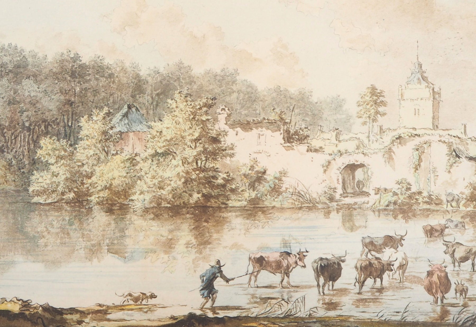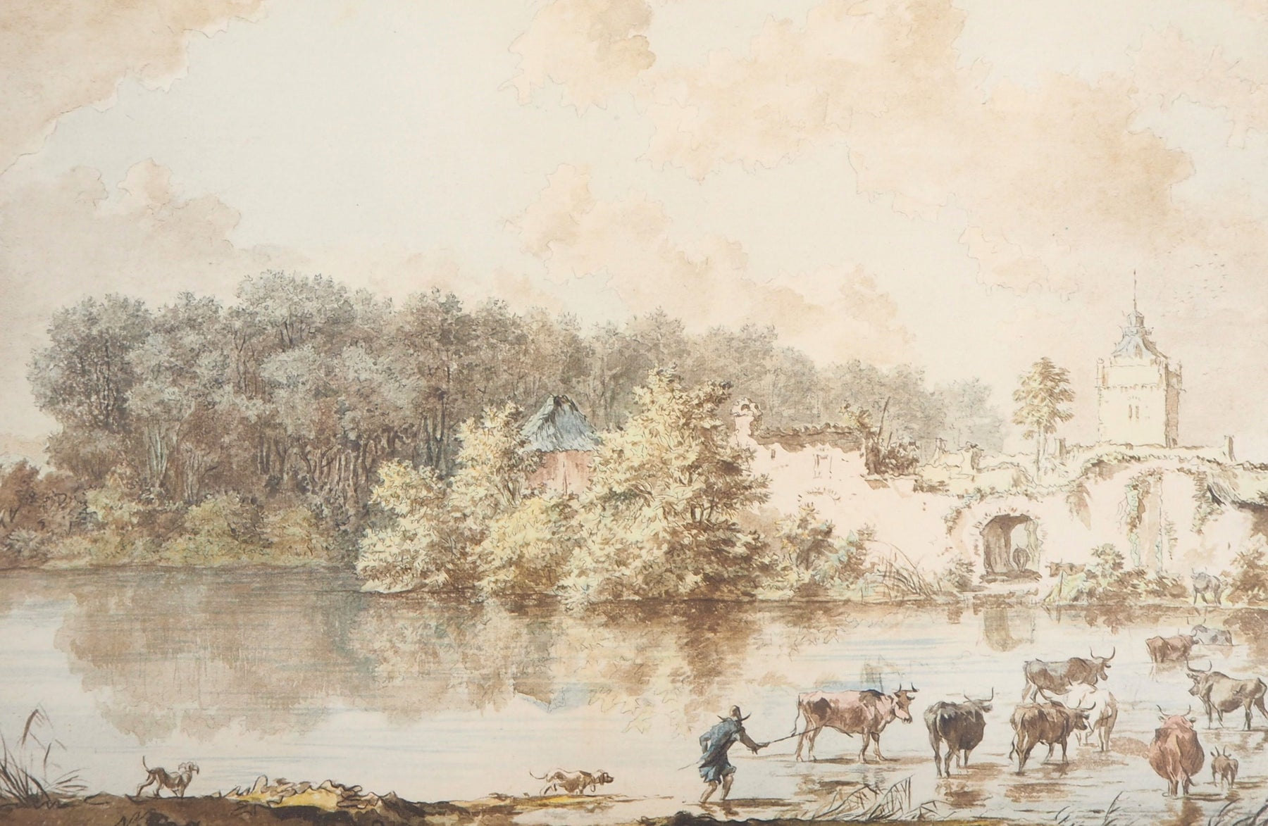 Lithographie réhaussée au pochoir d'après une aquarelle