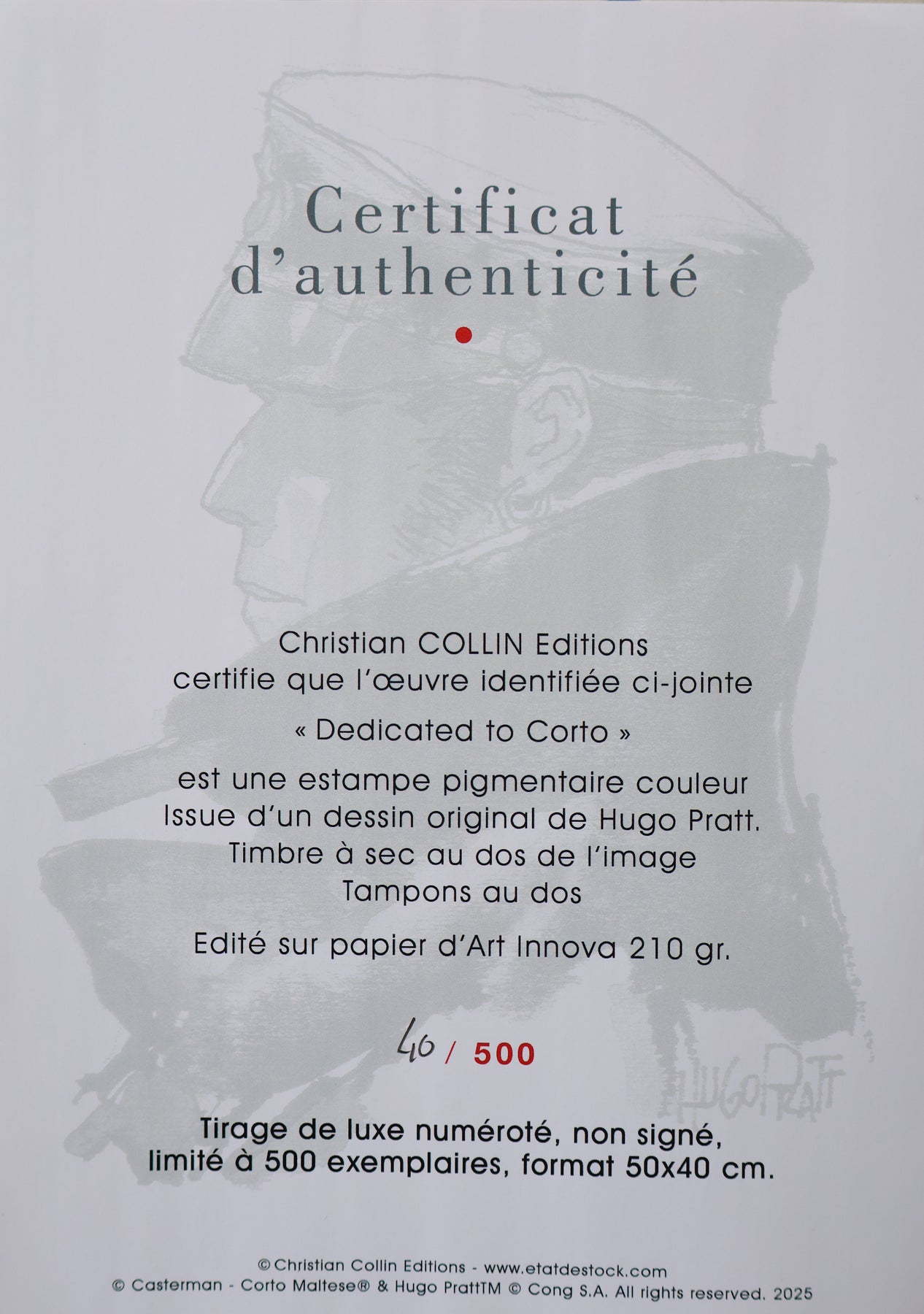 INFORMATIONS : Editée en 2024 par les éditions Christian Collin, cette estampe est authentifiée par le timbre sec et le tampon officiel "Hugo Pratt" au dos.