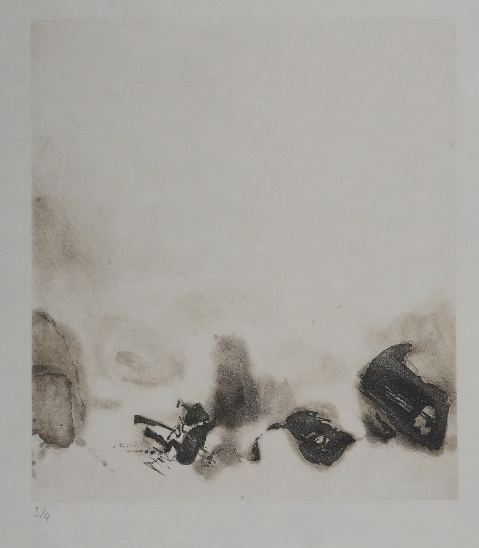 INFORMATION : Cette gravure a été créée pour le portefolio L'étang (poème de Jean Lescure) et publié en 1972 par les Editions Galanis. Il s'agit ici d'une épreuve d'état pour le premier passage de couleur.