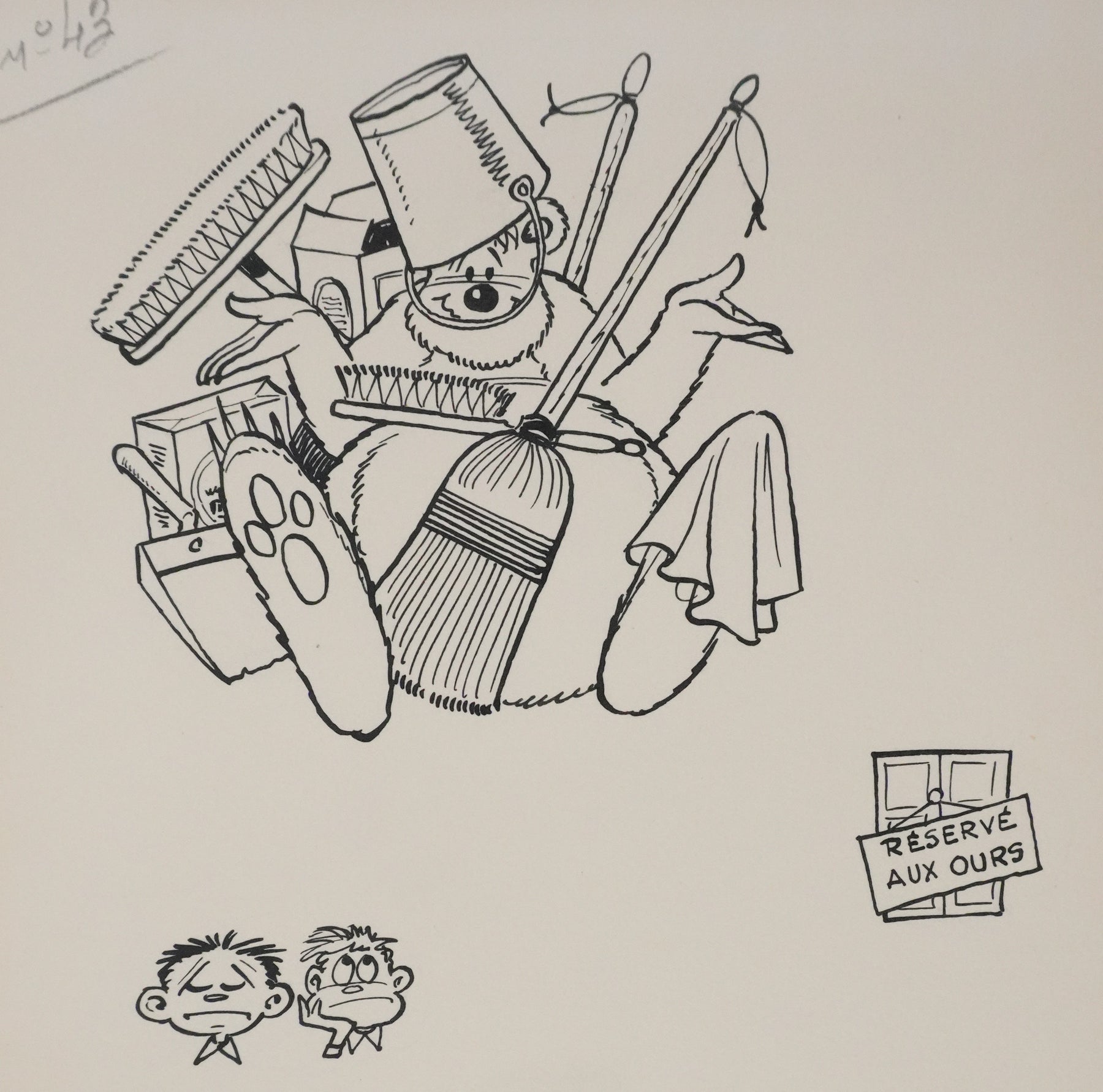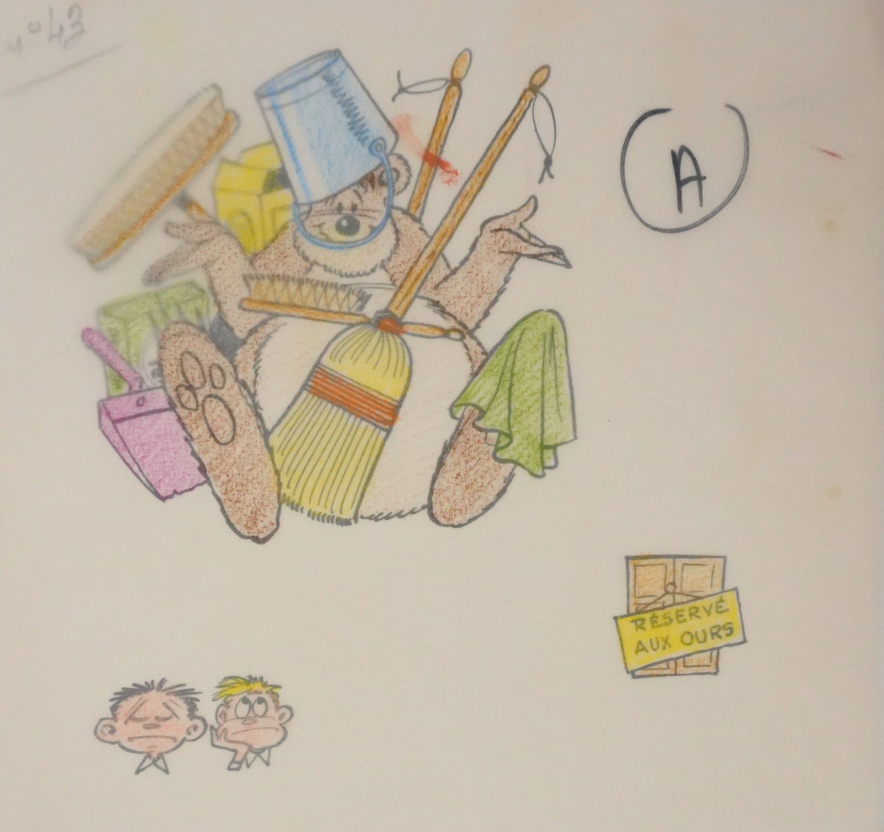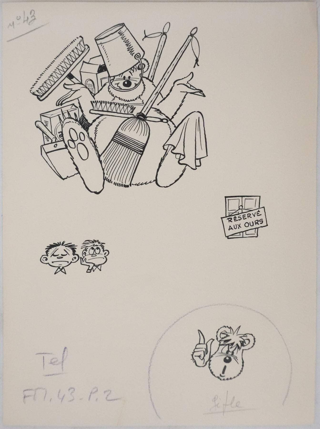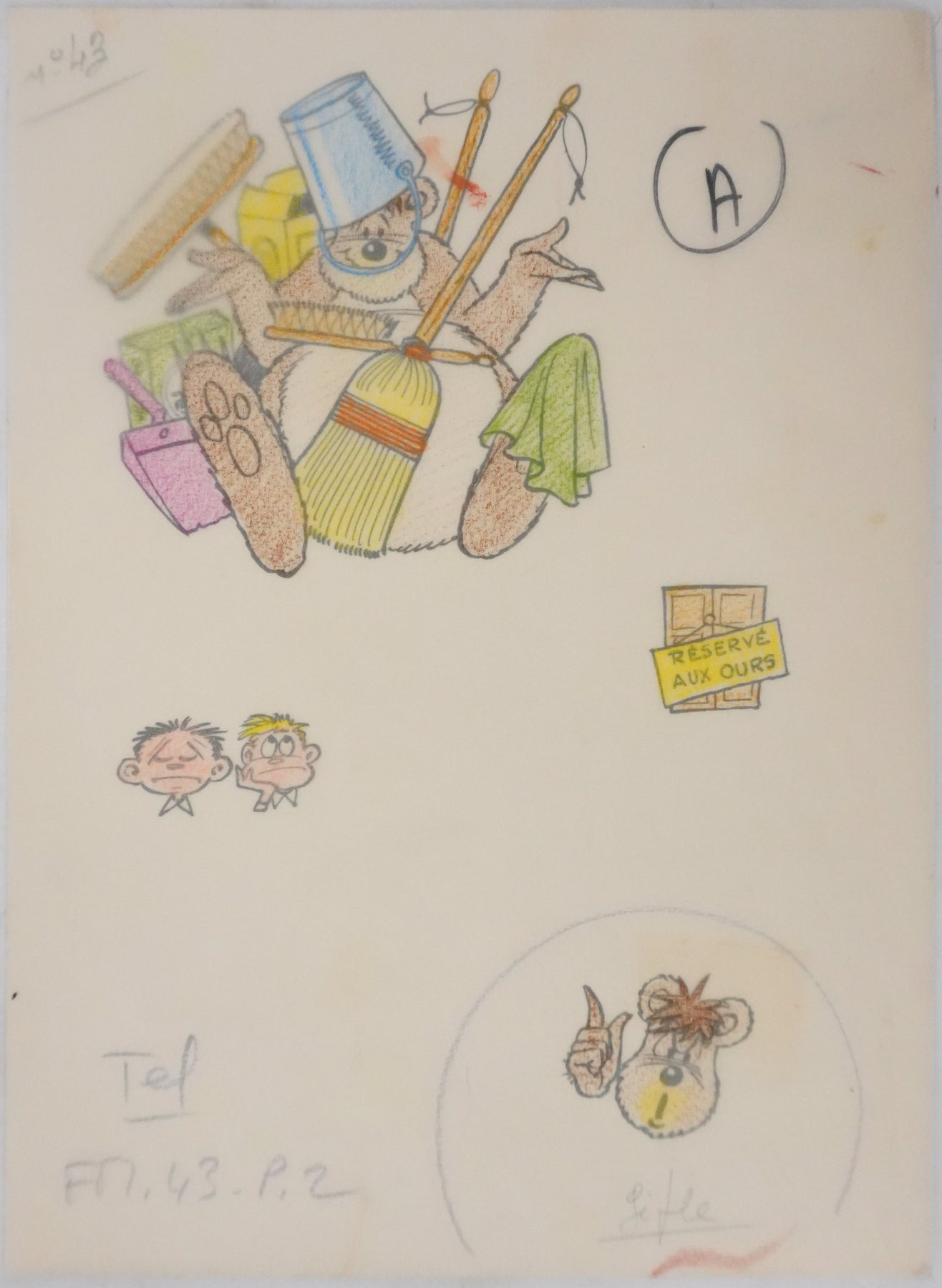 Dessin original à l'encre de Chine, accompagné d'un calque de mise en couleurs au crayon