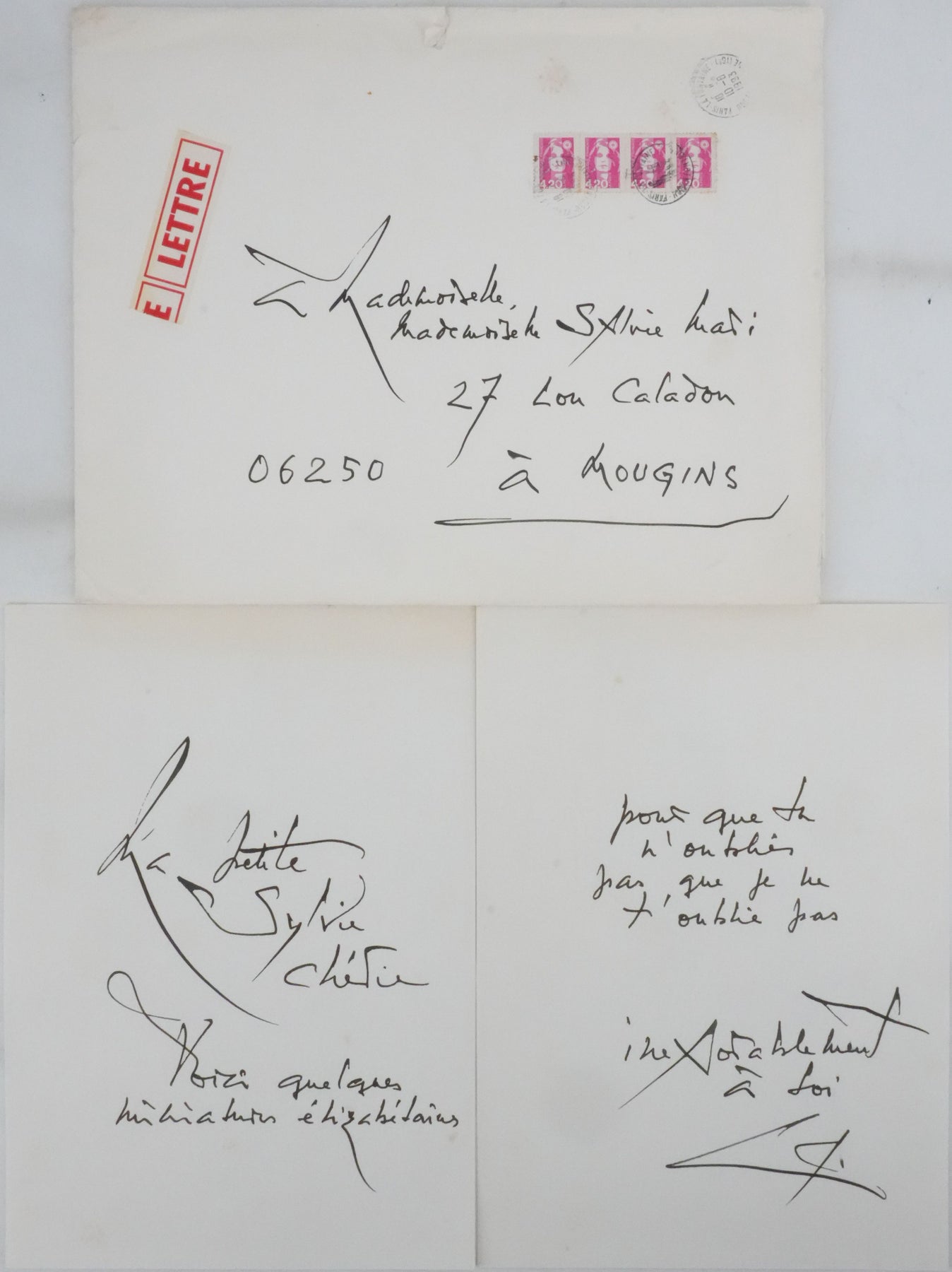 INFORMATION : Accompagné de son enveloppe originale avec les timbres d'époque et une carte avec une photo (voir photo). Lettre envoyée par Georges Mathieu à Sylvie Mari dans laquelle il lui envoie un article concernant La miniature élizabéthaine.