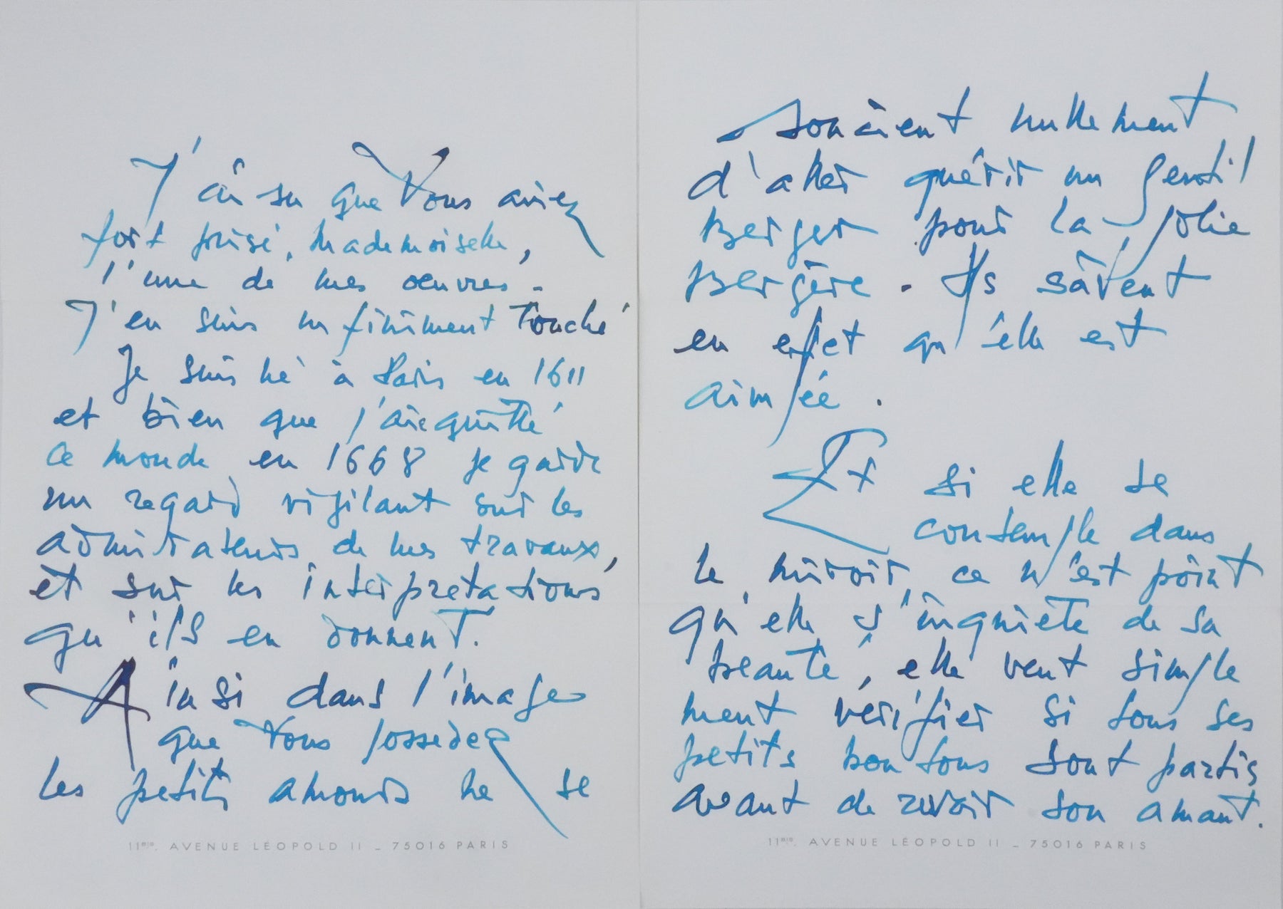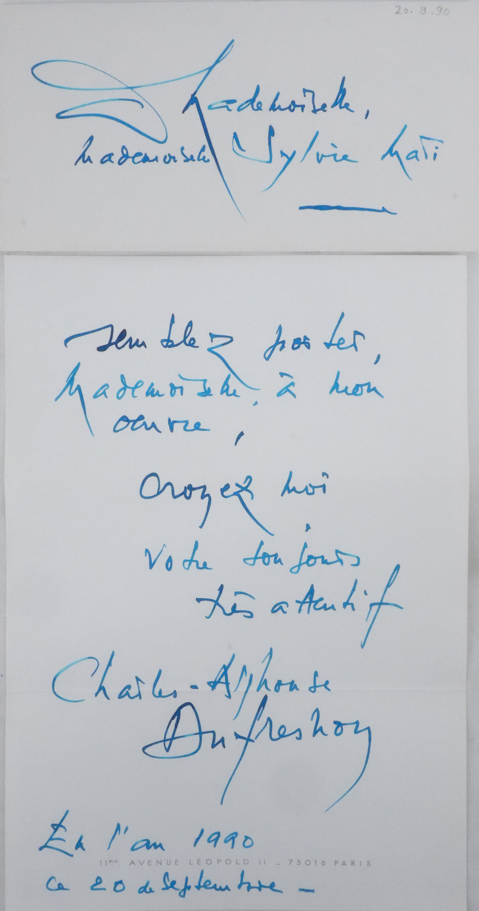 INFORMATION : Accompagné de son enveloppe originale avec les timbres d'époque (voir photo). Lettre envoyée par Georges Mathieu à Sylvie Mari dans laquelle il dit être le peintre Charles Alphonse Dufresnoy.