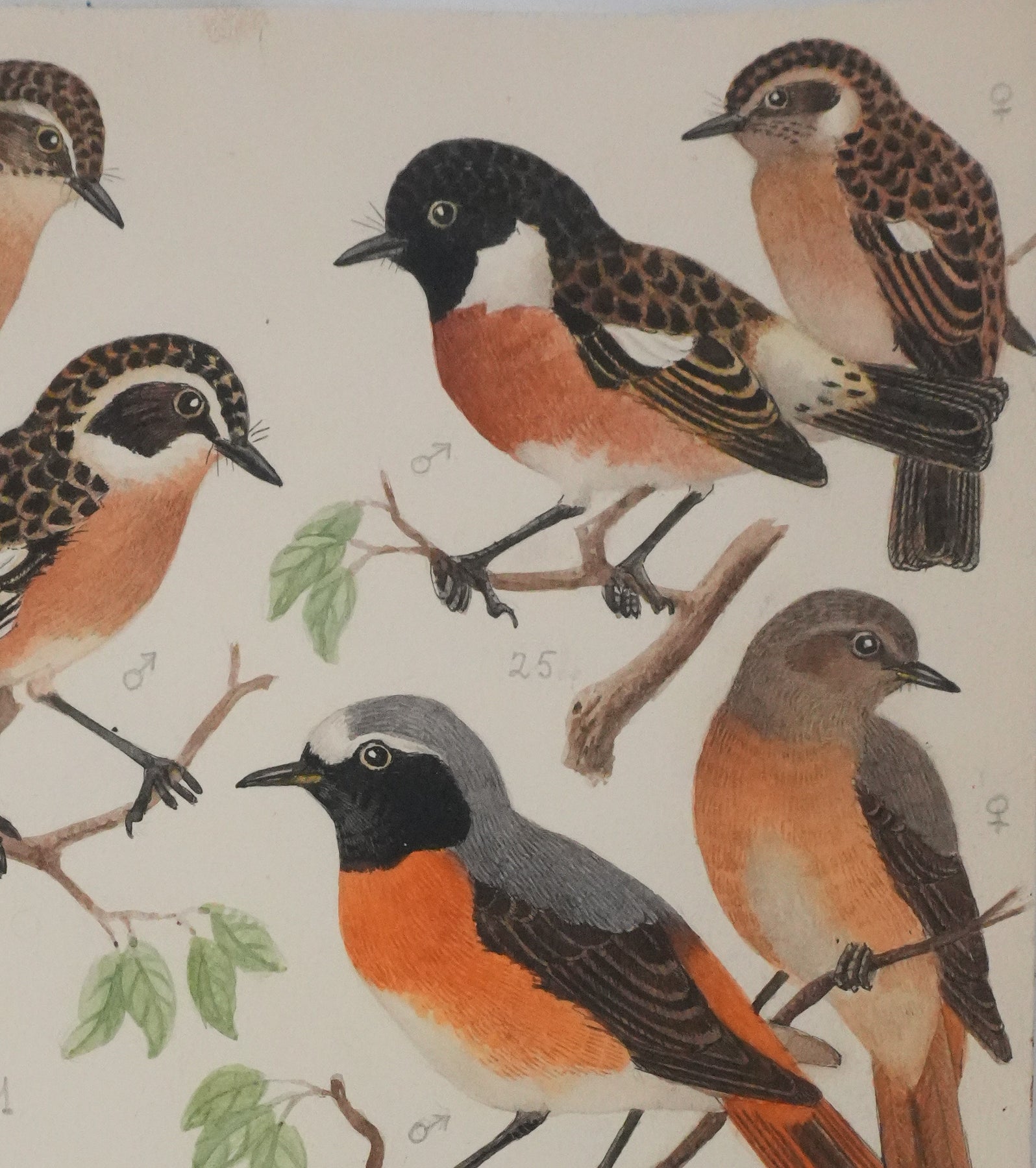 Planche d'ornithologie : Tarier des prés, Rouge queue et Calliope sibérienne, 1959
