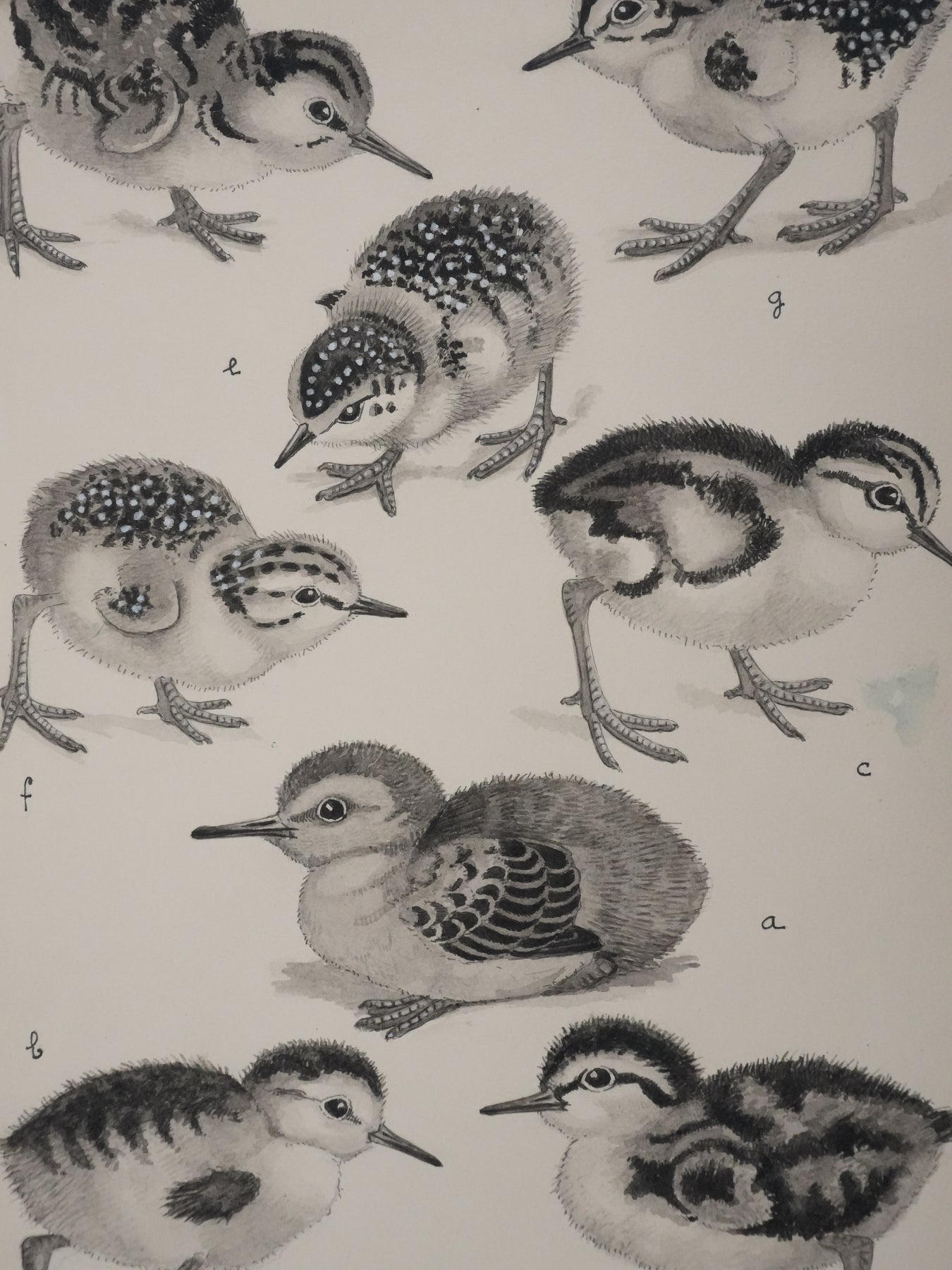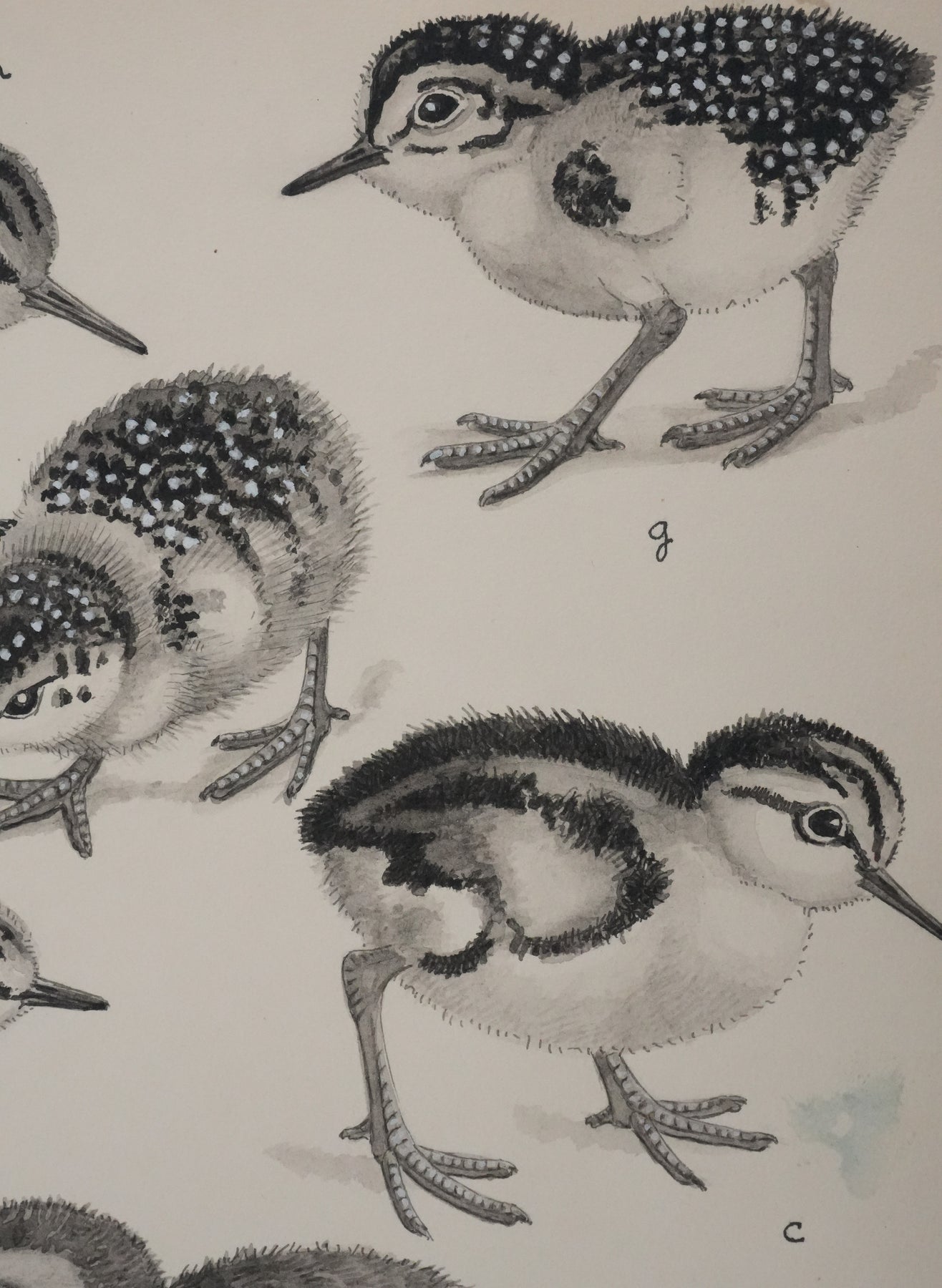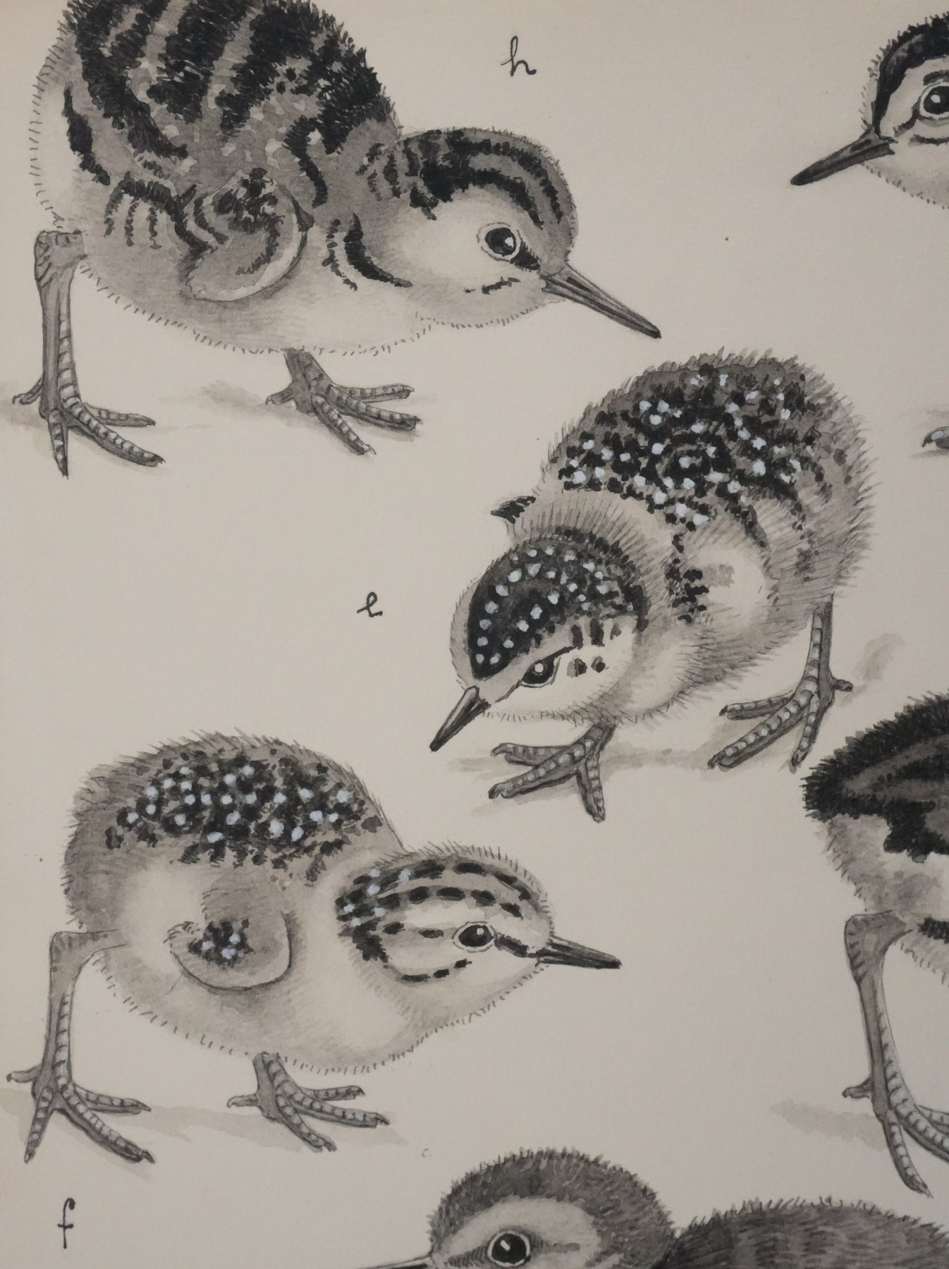 Planche d'ornithologie : Poussins (Bécasseaux, Chevaliers et Barge rousse)