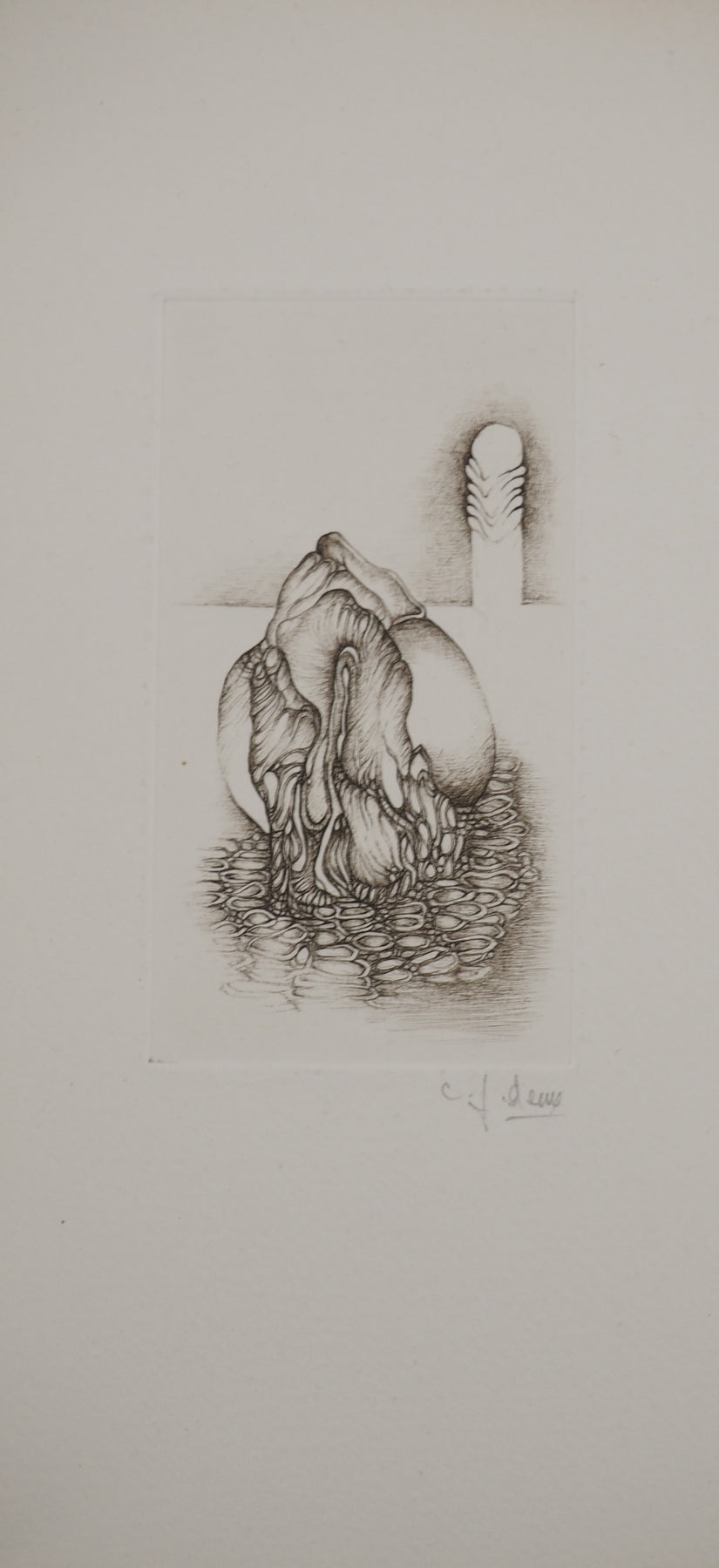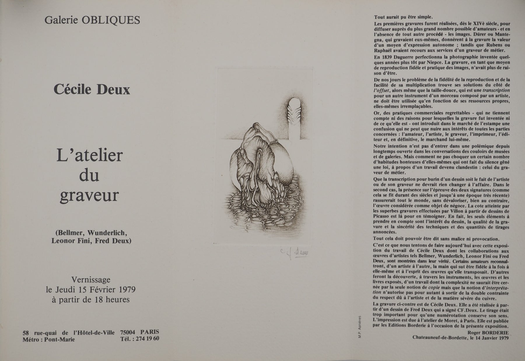 INFORMATION : Carton d'invitation pour le vernissage de l'exposition L'atelier du graveur, de Cécile Deux (Cécile Reims). Editée par Galerie Obliques.