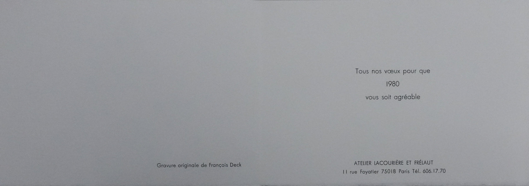 INFORMATION : Texte au dos. Carte de vœux éditée par les ateliers Lacourière et Frélaut pour l'année 1980.