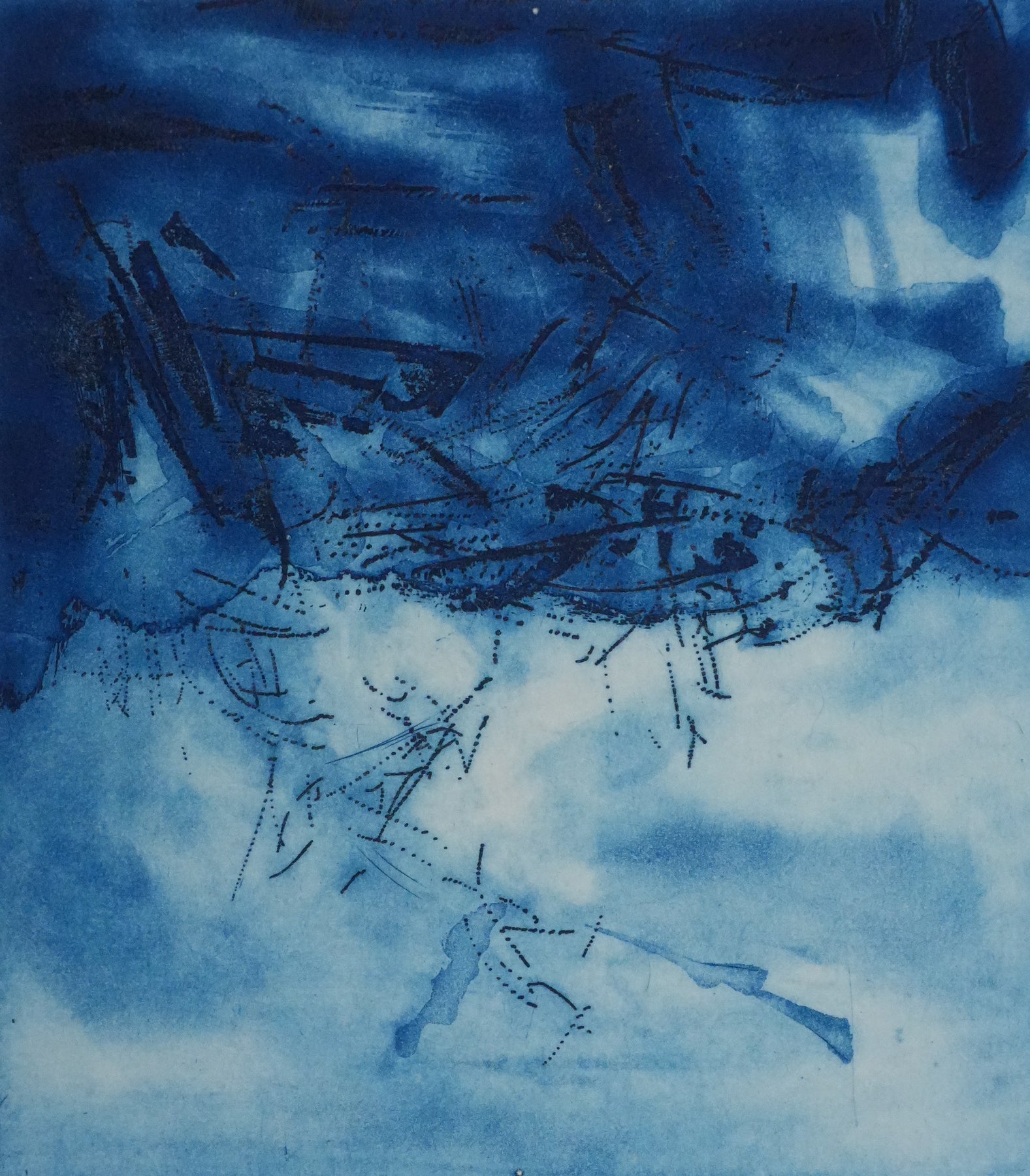 INFORMATION : Cette gravure a été créée pour le portefolio L'étang (poème de Jean Lescure) et publié en 1972 par les Editions Galanis. Il s'agit ici d'une épreuve d'état pour le premier passage de couleur.