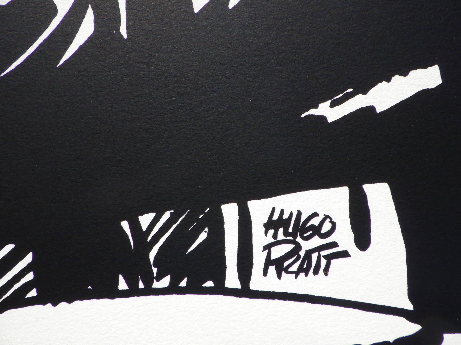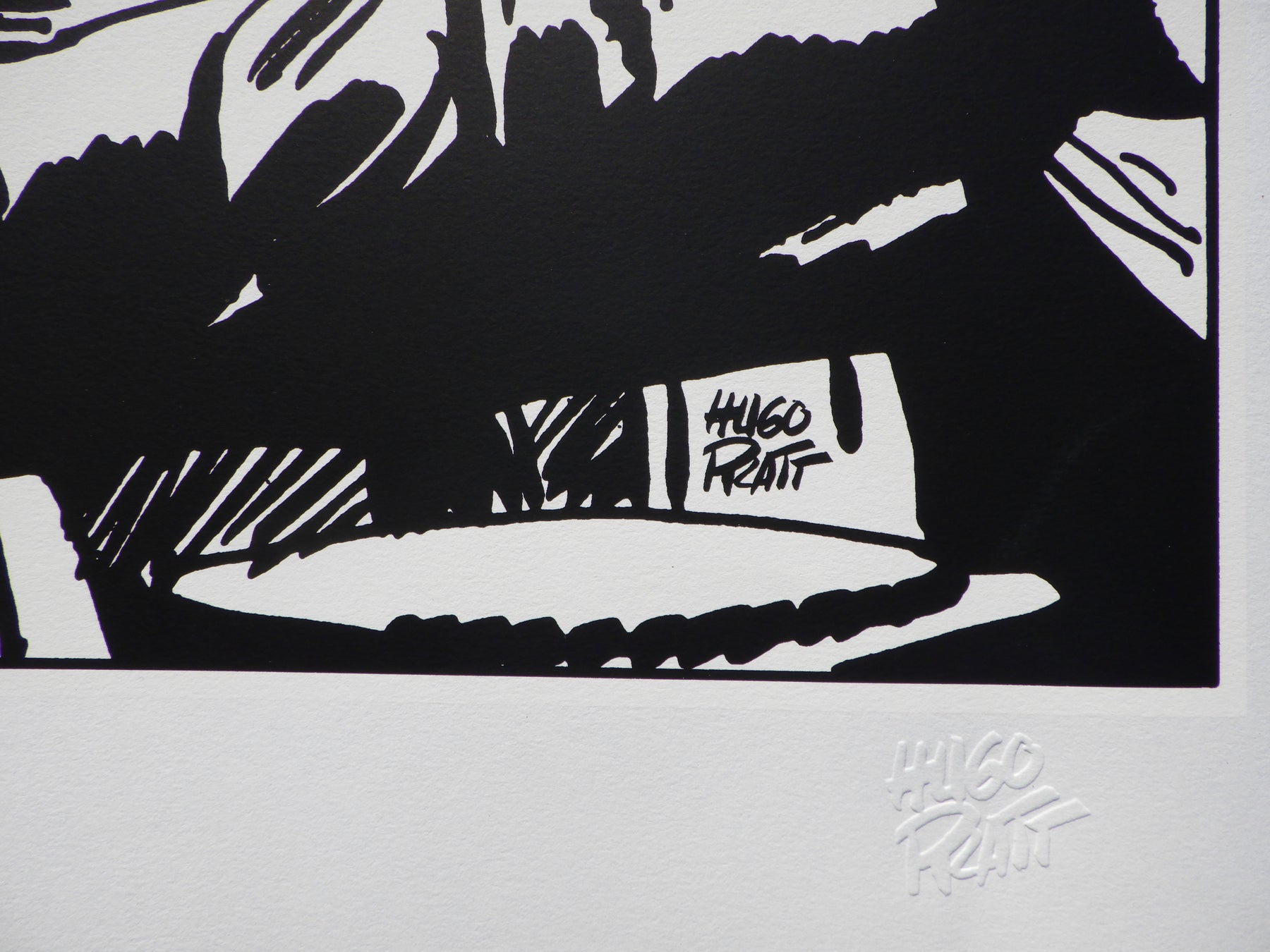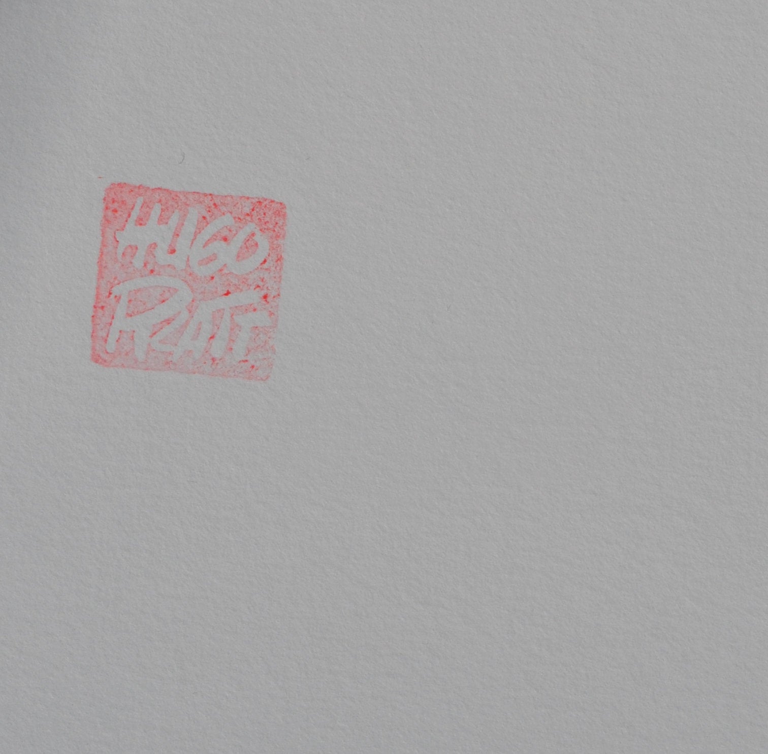INFORMATION: Dieser 2020 von Christian Collin veröffentlichte Siebdruck ist durch den Trockenstempel und den offiziellen „Hugo Pratt“-Stempel auf der Rückseite authentifiziert.