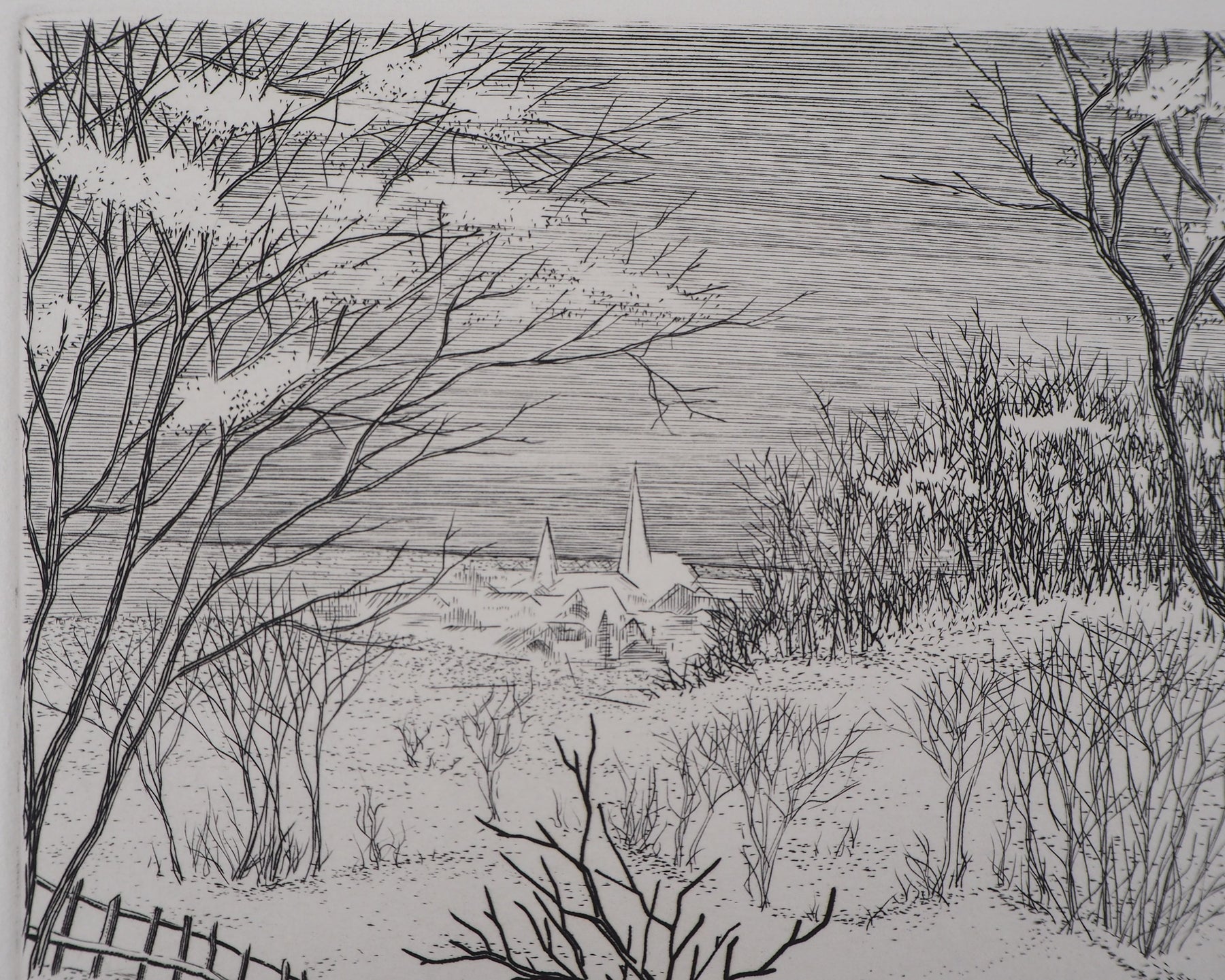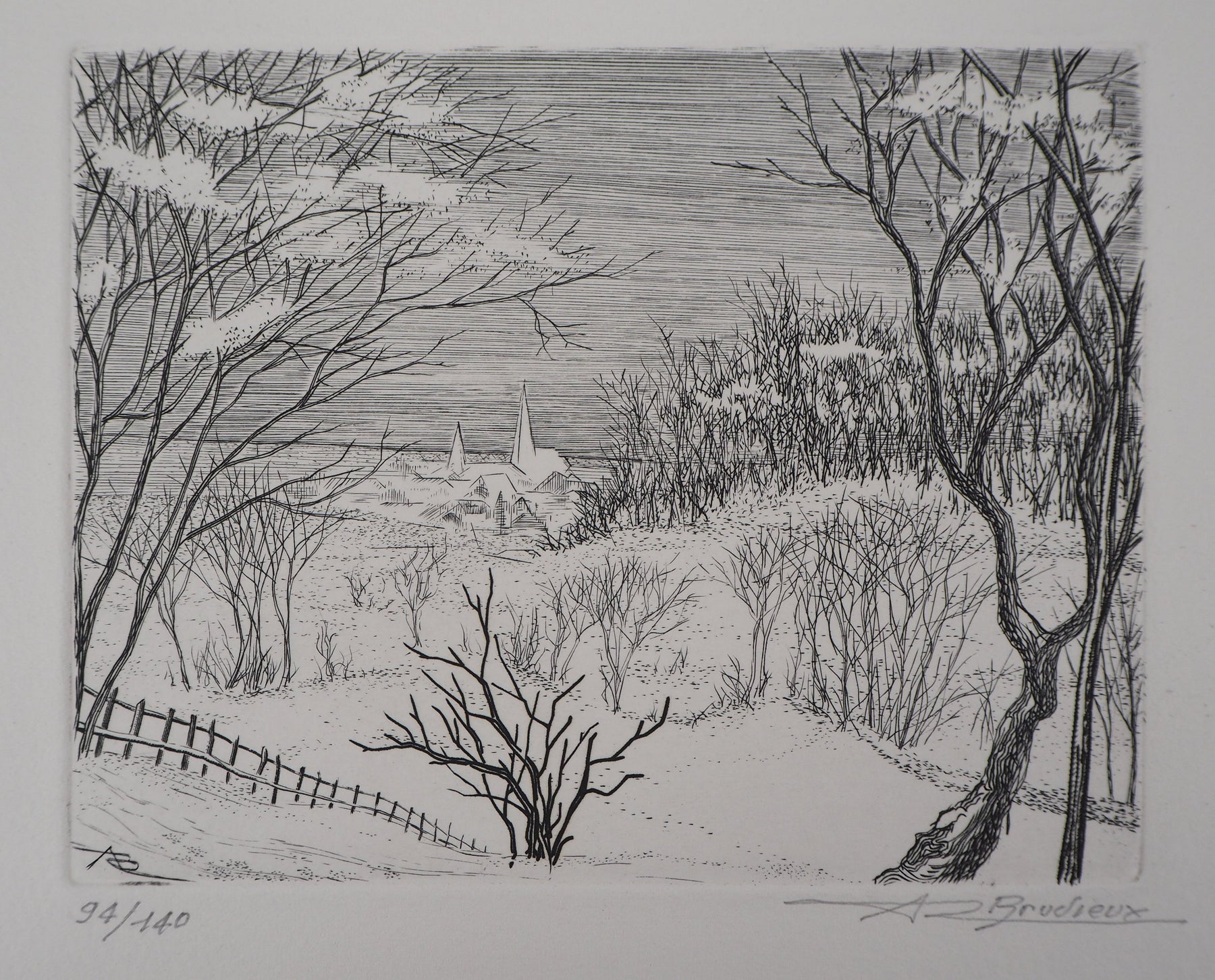 BT Roland BRUDIEUX: Blick auf das Dorf unter dem Schnee, Original signierter Kupferstich