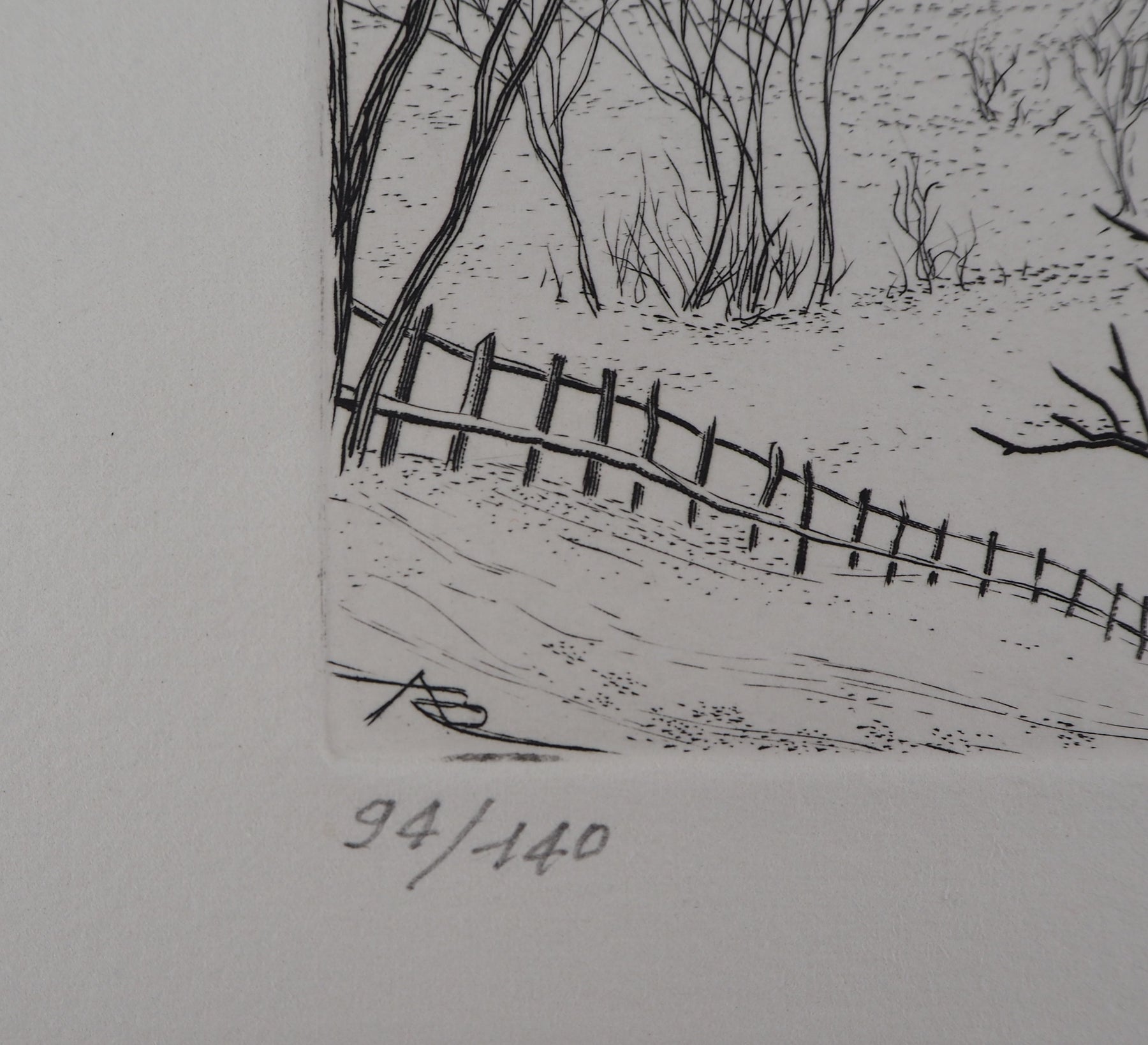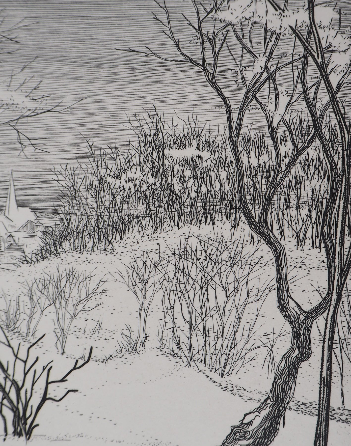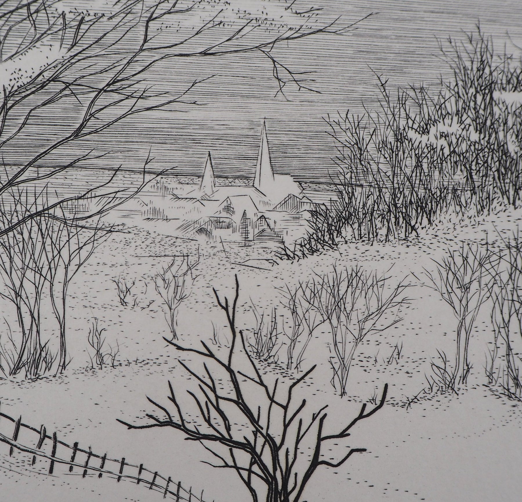 André Roland BRUDIEUX : Vue du village sous la neige - Gravure (détail)