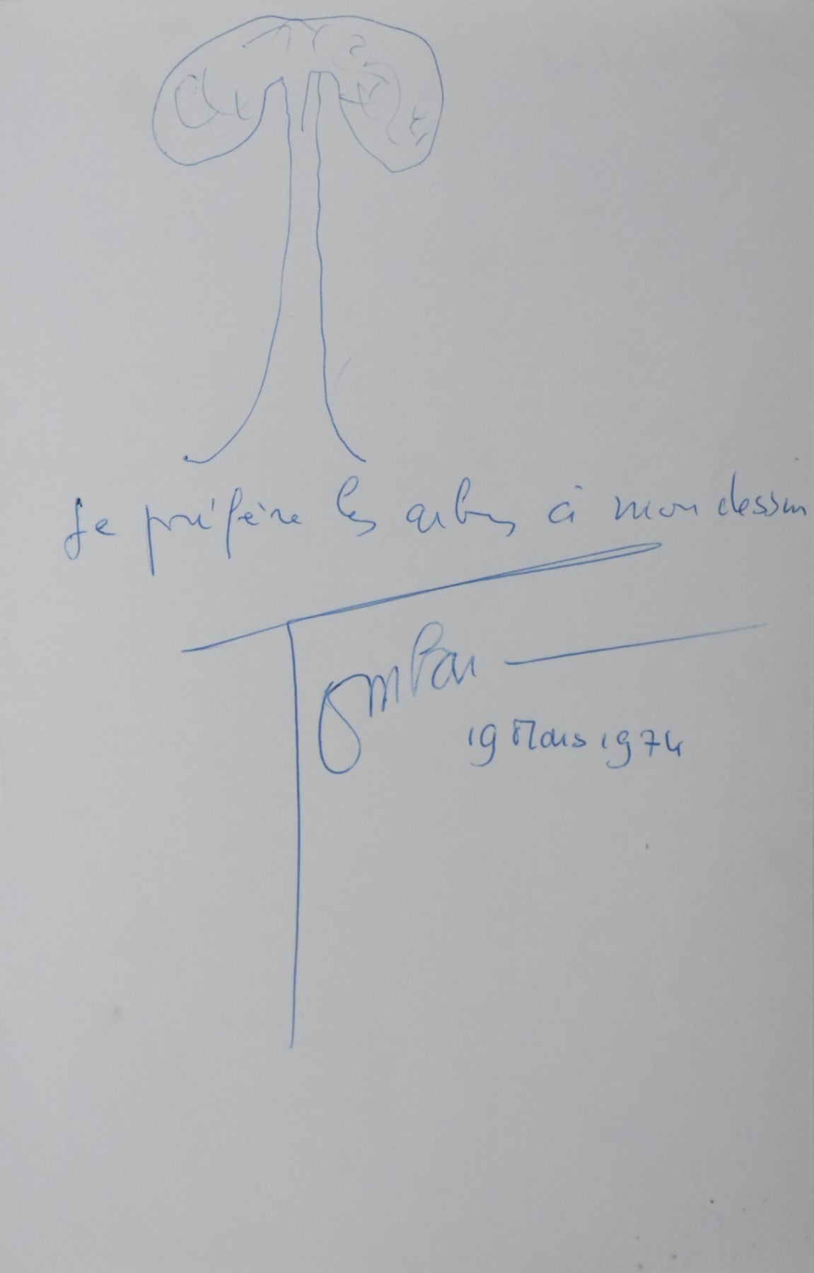 PROVENANCE : Ce dessin provient de la collection personnelle de Pierre Lhoste. Journaliste de radio, Pierre Lhoste (1913-1984) demanda aux personnalités qu’il recevait de réaliser un autographe accompagné d'un dessin d’arbre, constituant ainsi un témoignage unique de ses entretiens.