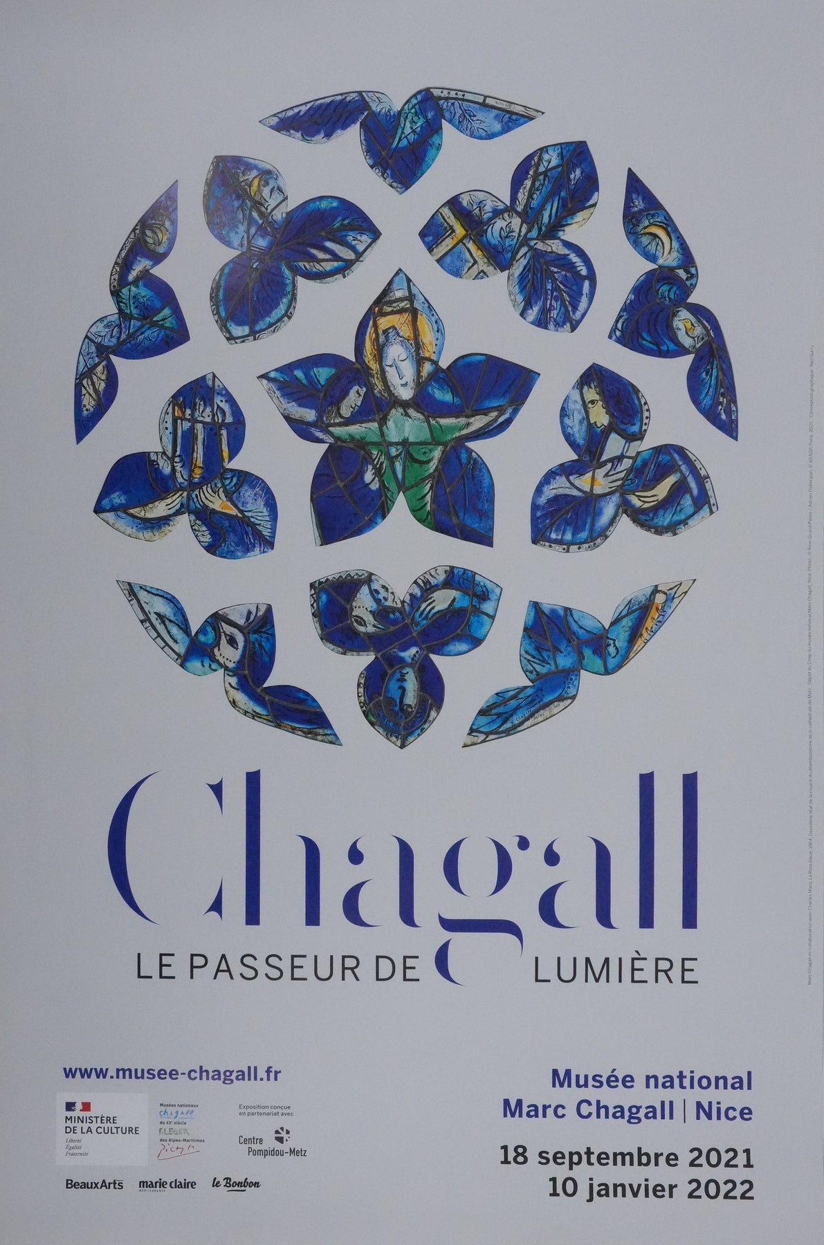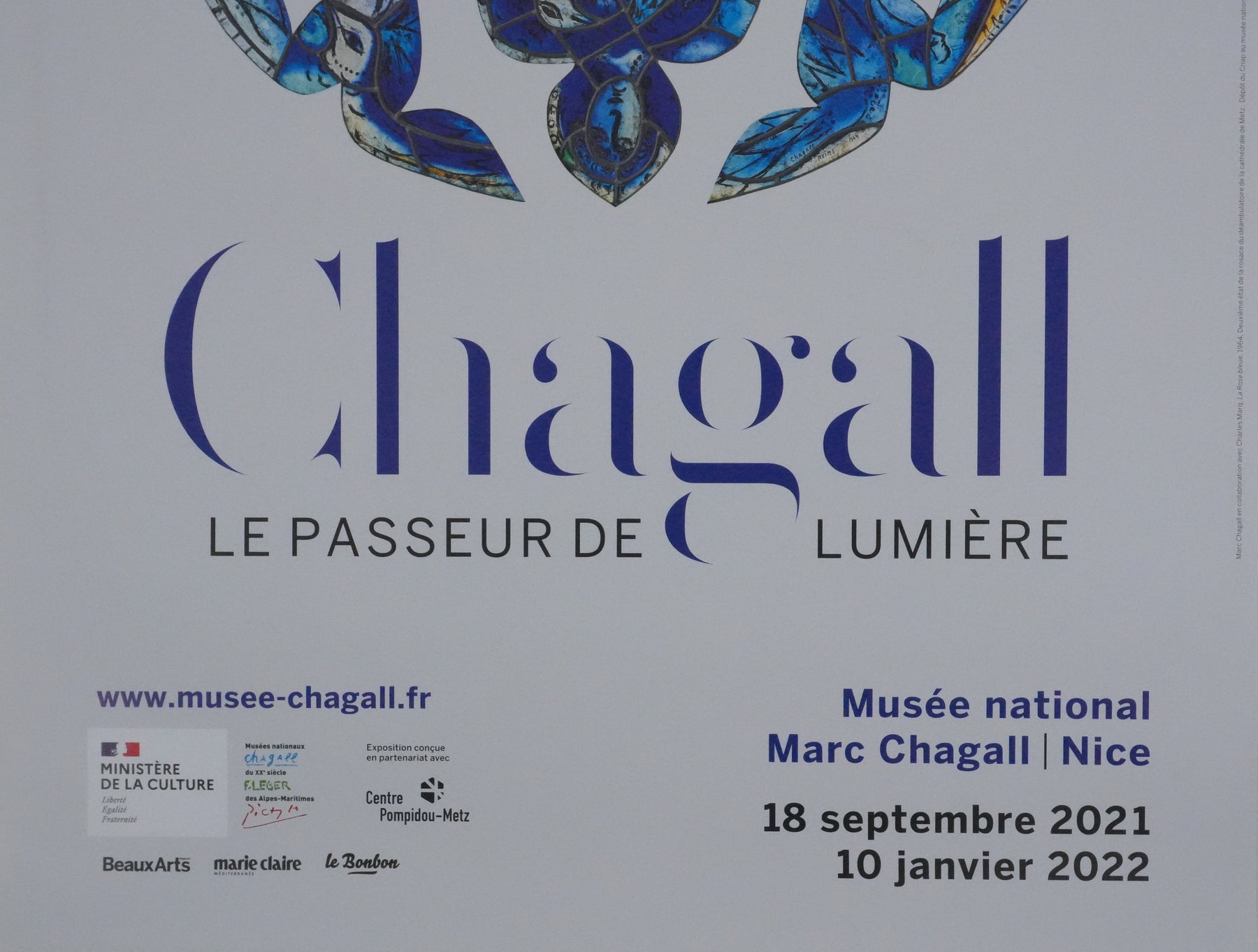 INFORMATION : Affiche originale créée pour l'exposition "Chagall, Le passeur de lumière" au Musée national Marc Chagall à Nice, en 2021.