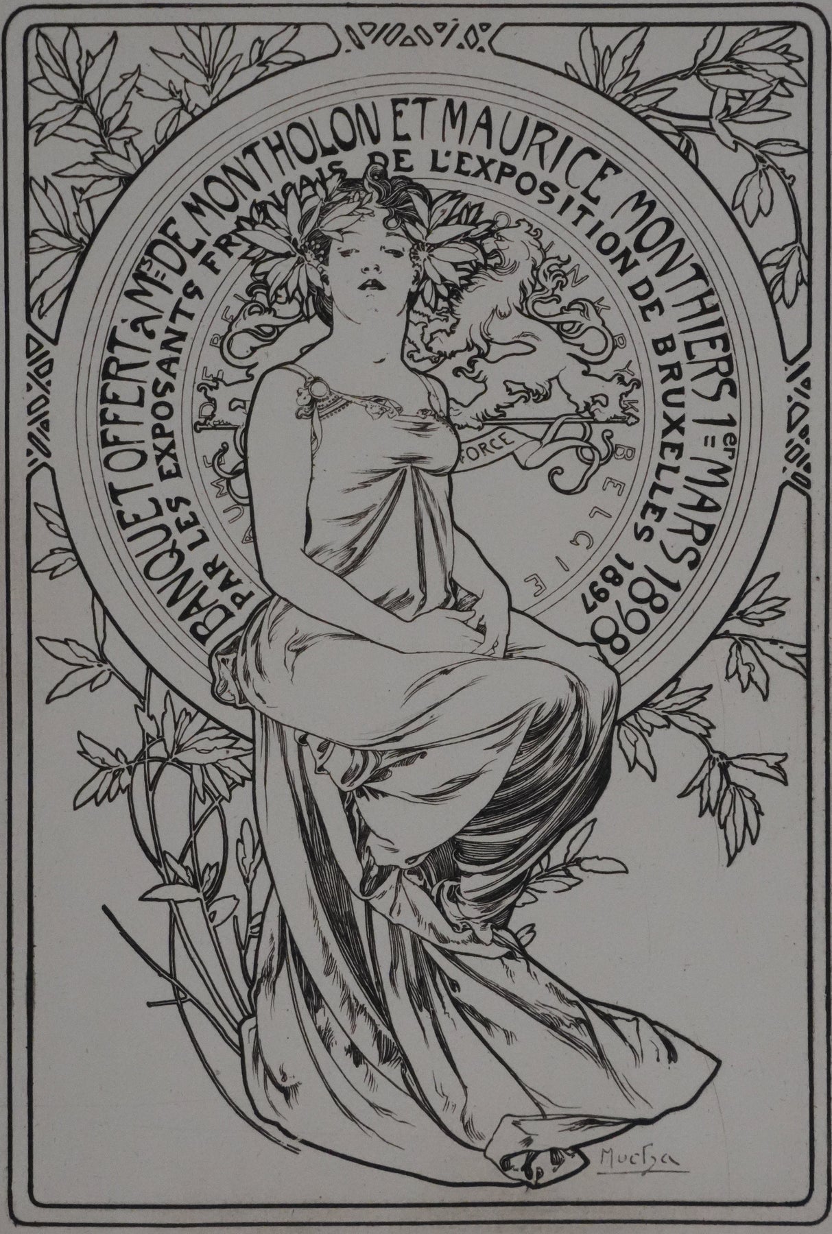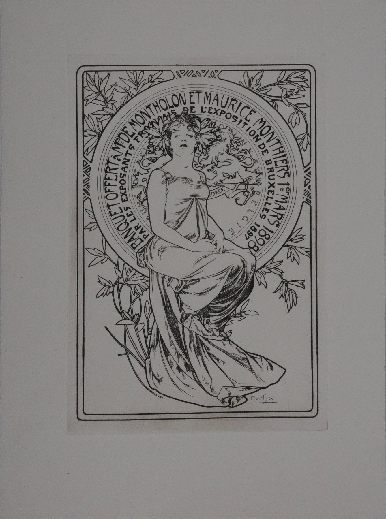 INFORMATION : Planche publiée par la Revue des Arts Décoratifs en 1898. Cette gravure a été créée par Mucha pour le Menu du banquet offert le 1er mars 1898 à M. de Montholon et Maurice Monthiers par les exposants français de l'Exposition de Bruxelles.
