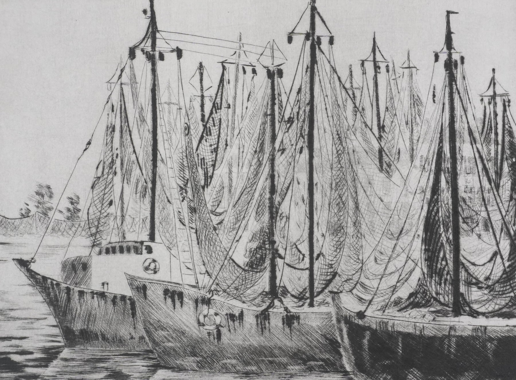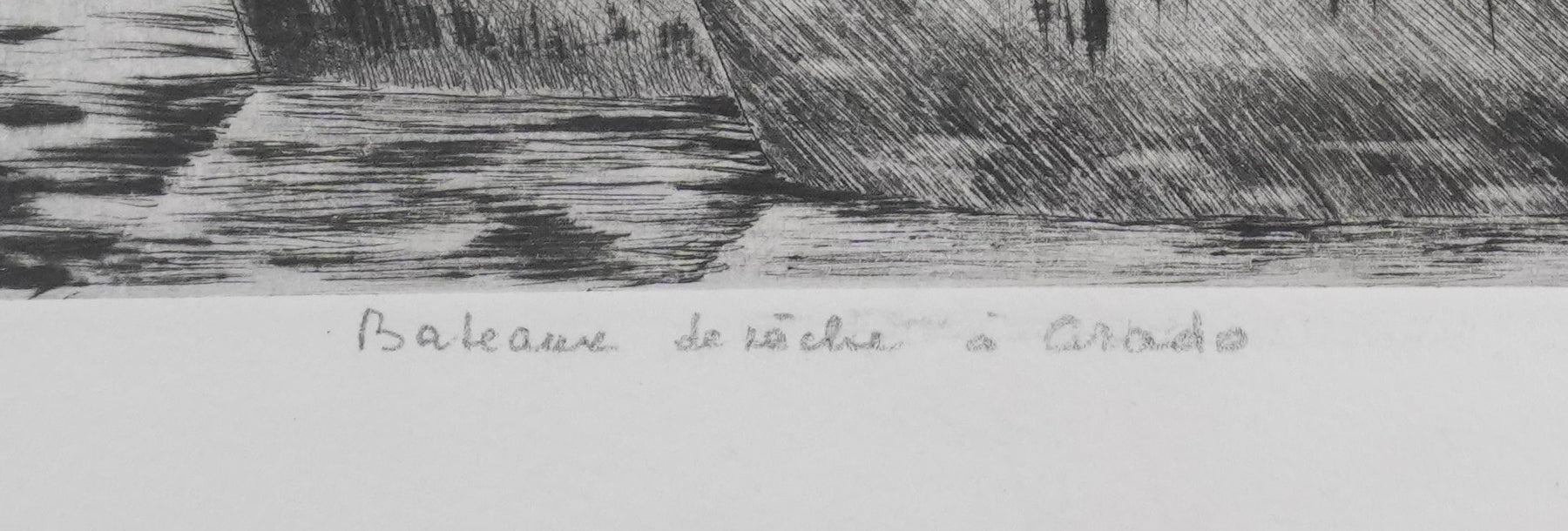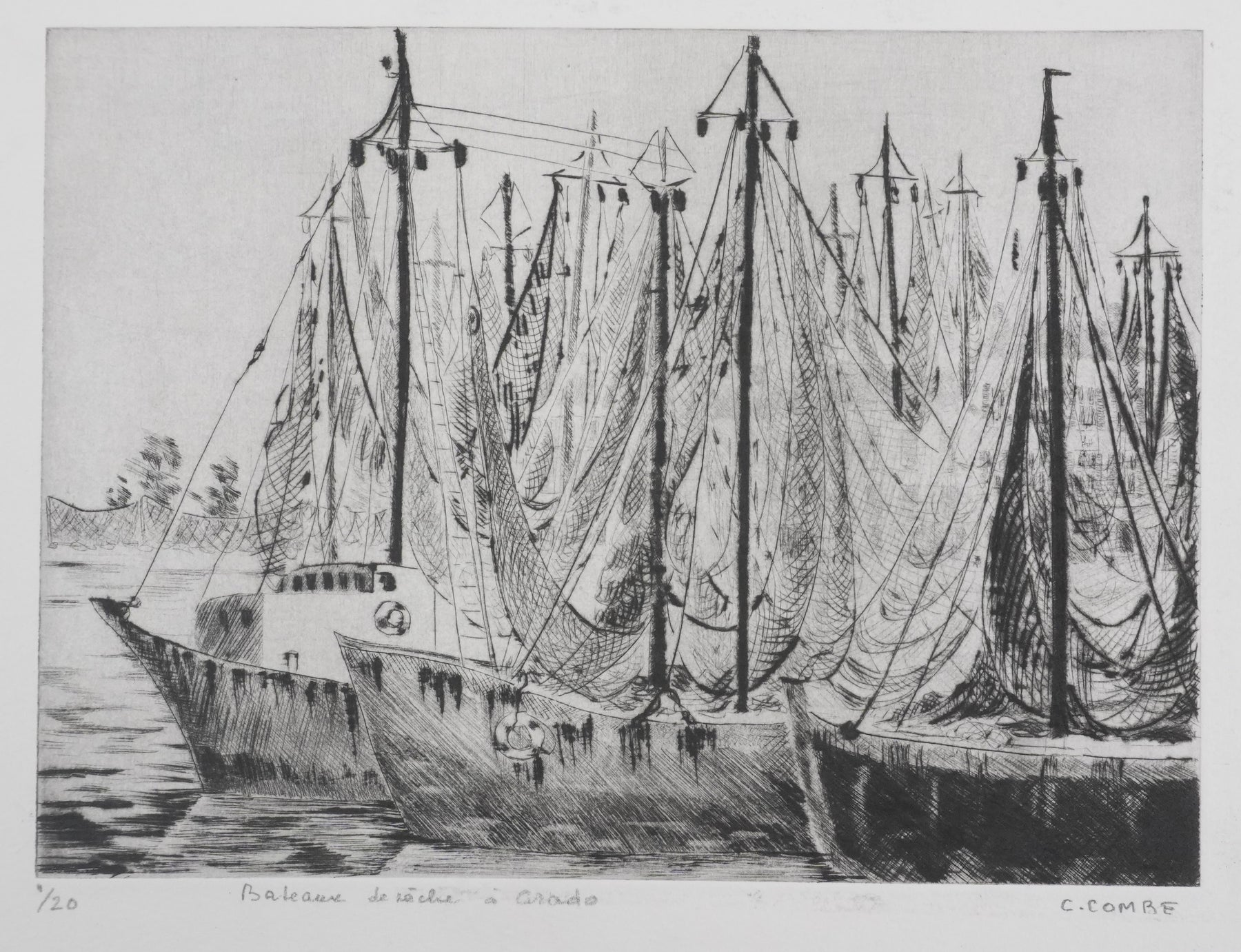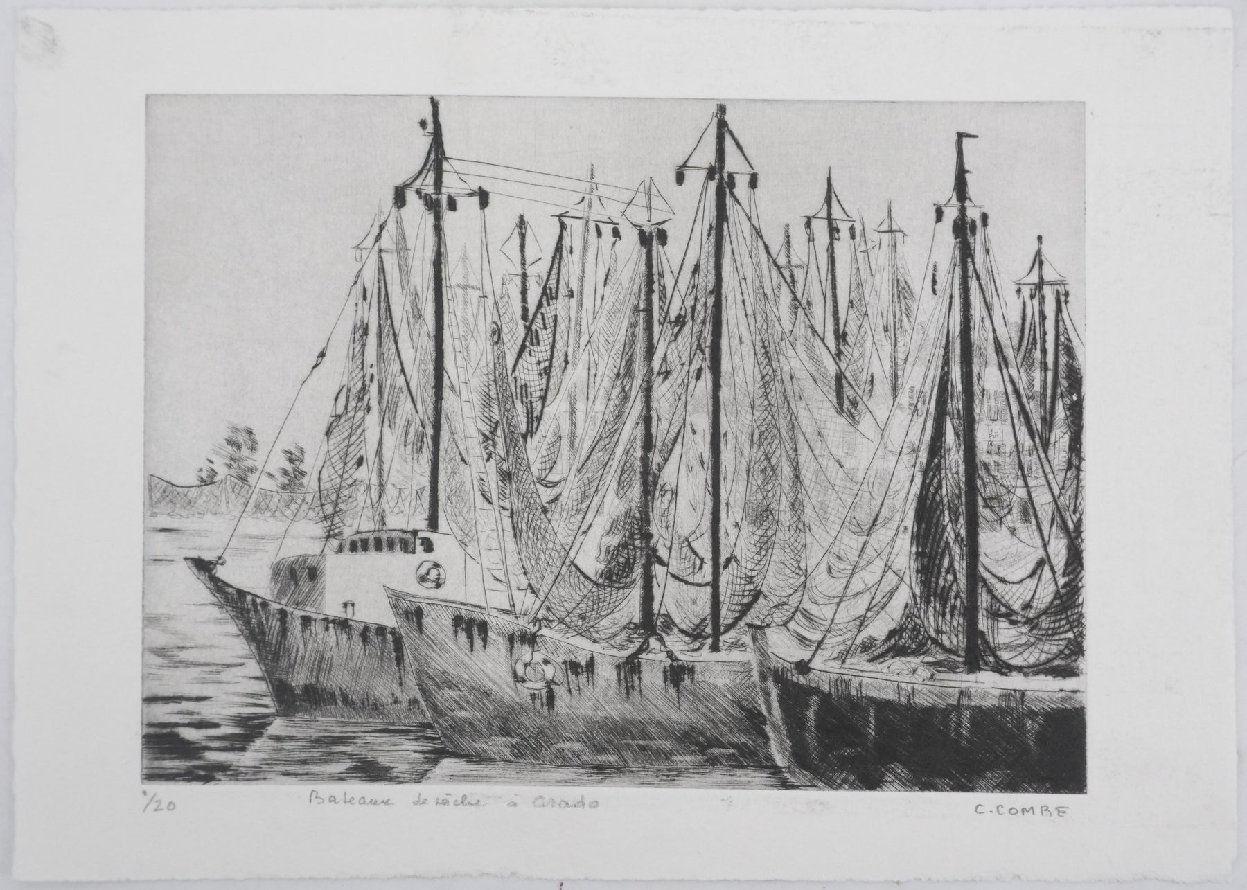 Camille COMBE : Bateaux de pêche à Grado, Gravure originale signée