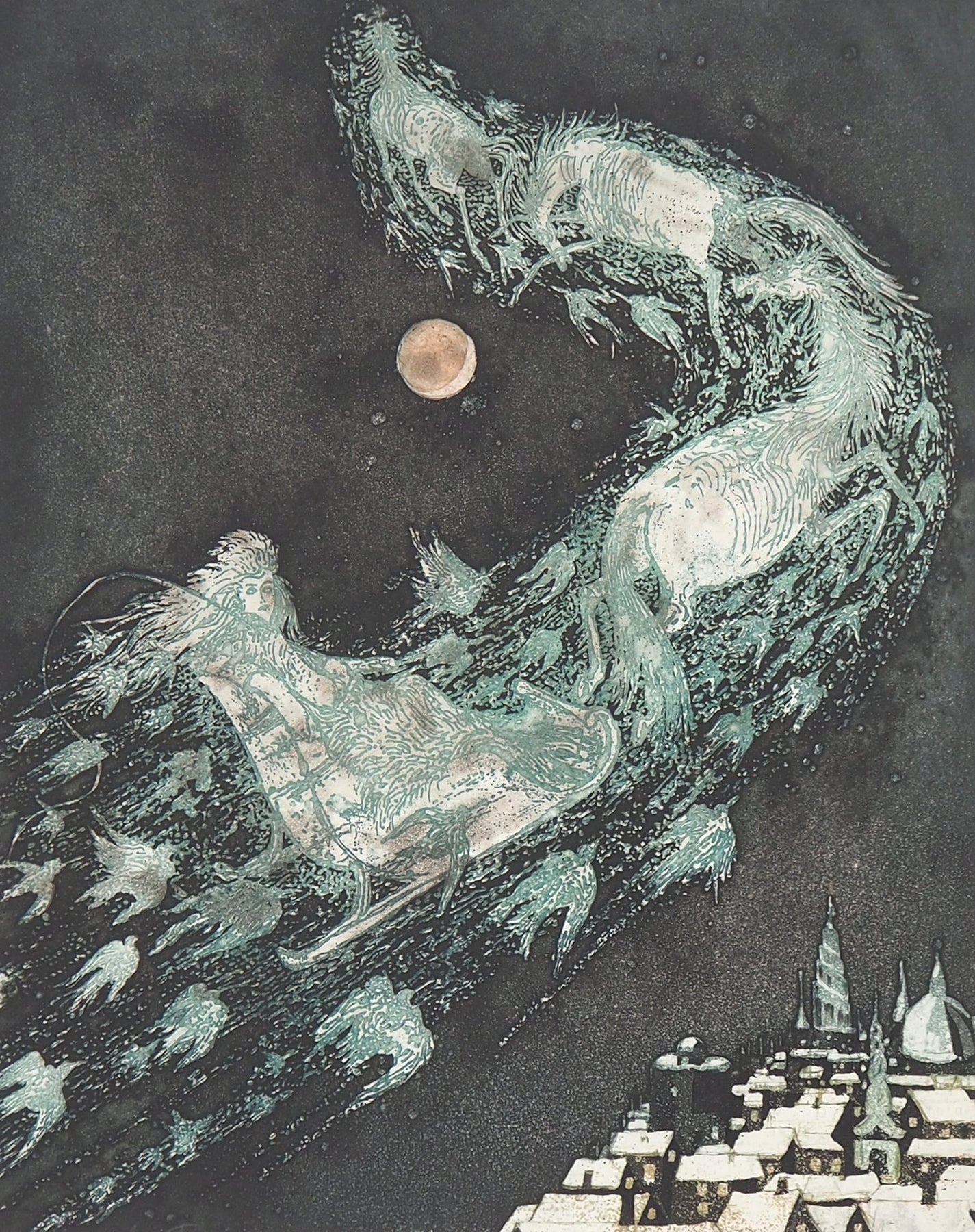 - Cette gravure fait partie de la série "Autour de la reine des neiges" d'après le conte de H. C. Andersen, présenté avec le texte de Jean Bouret
