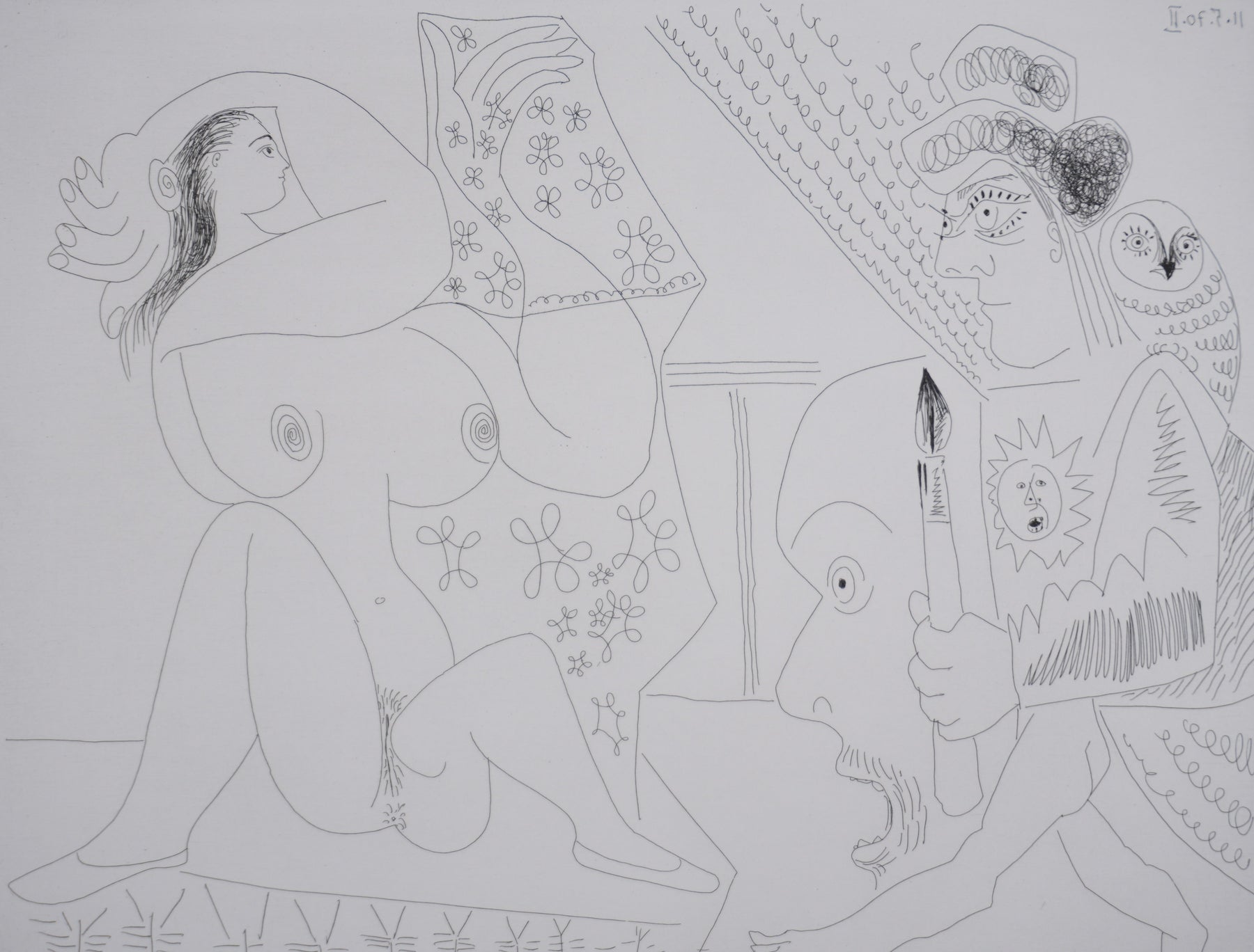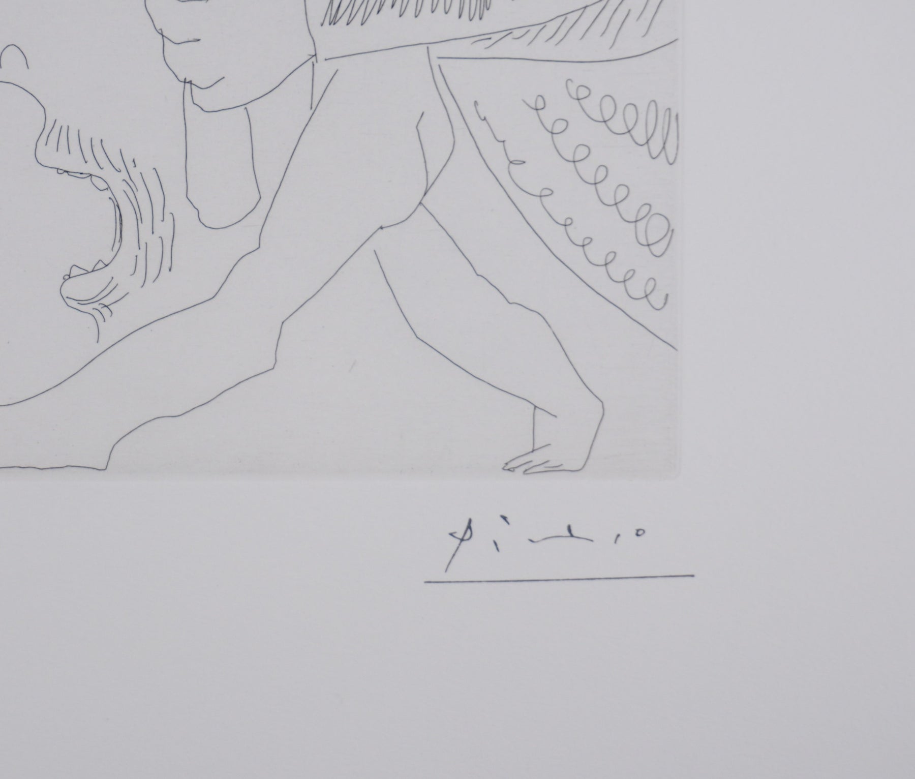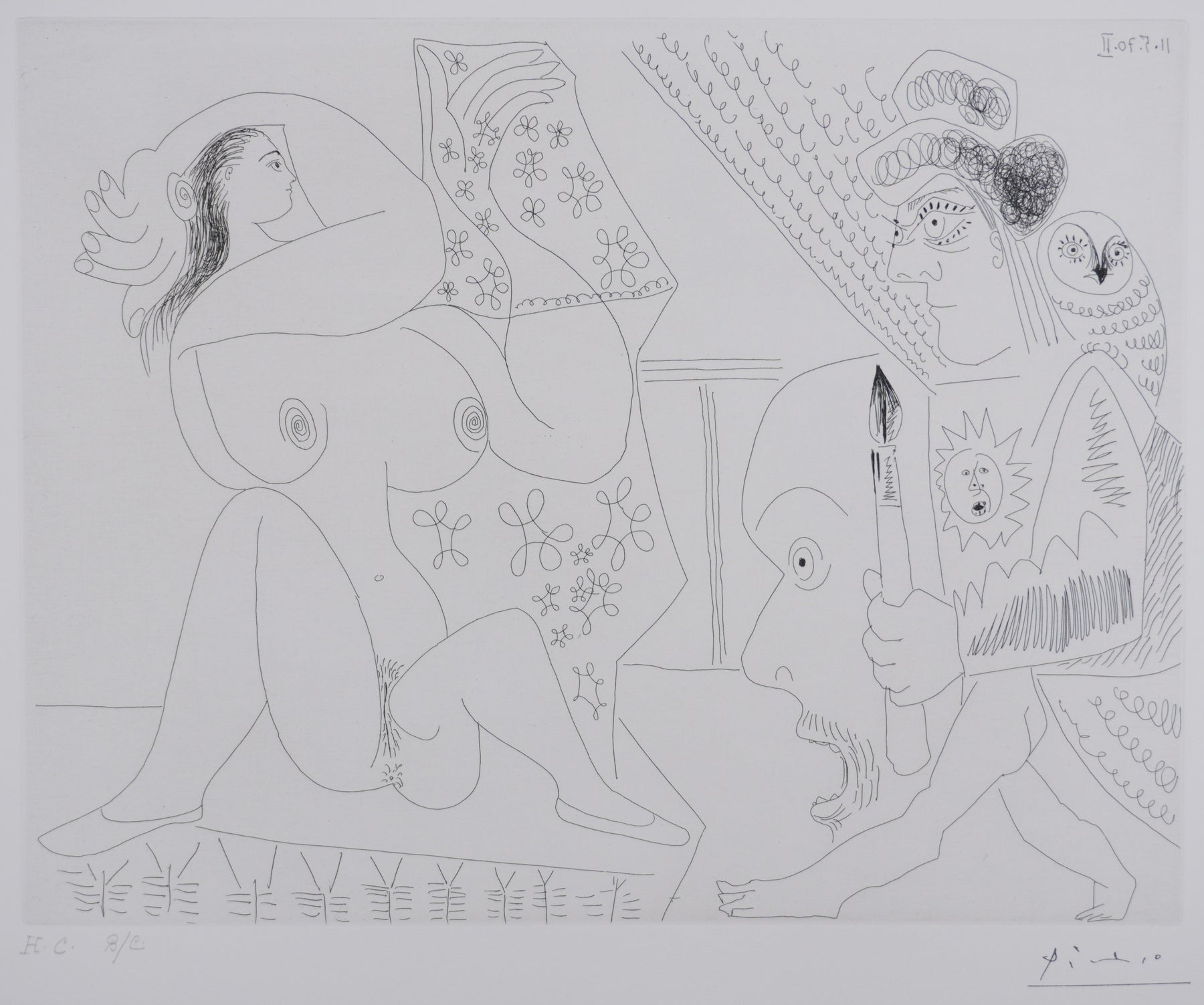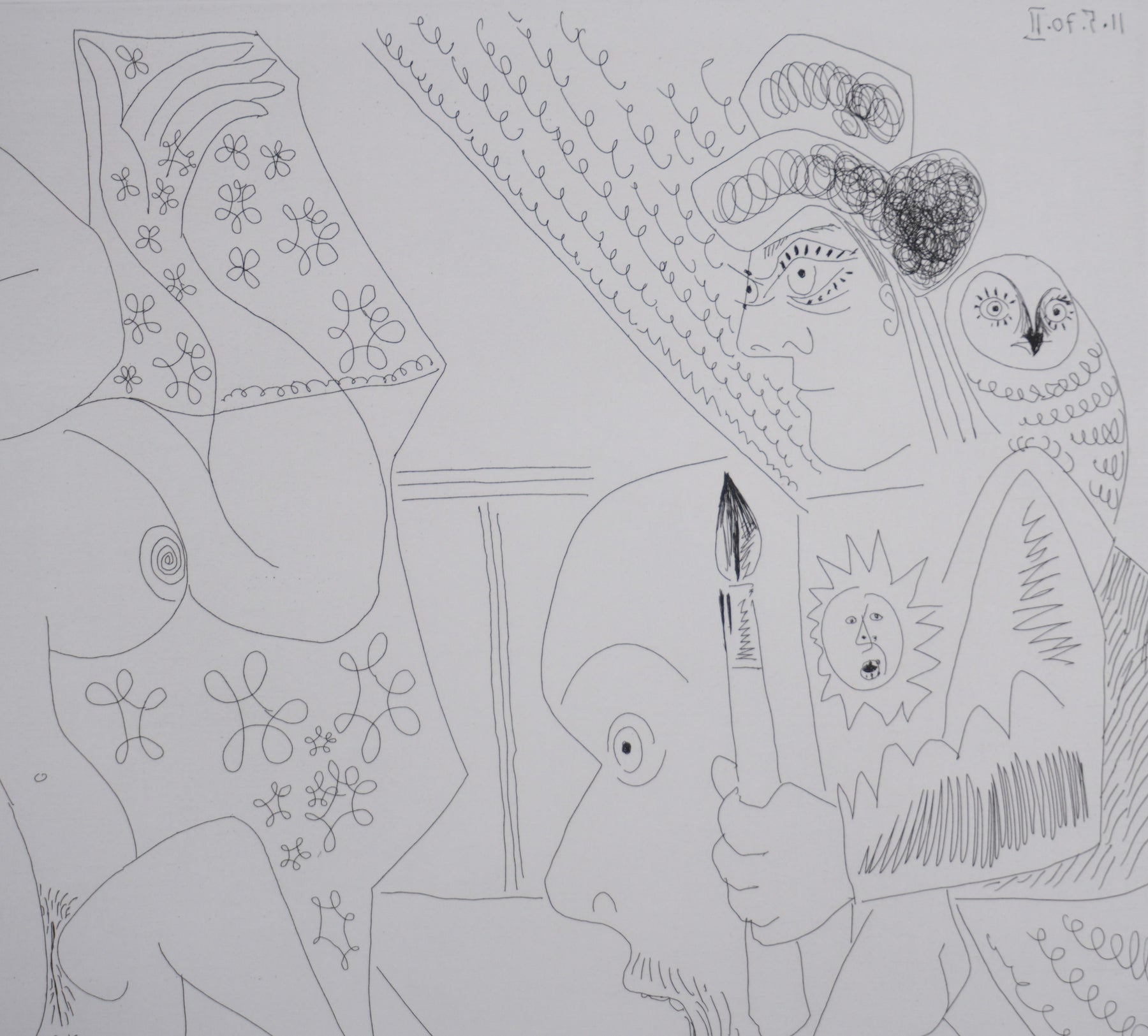 INFORMATION : La série dite des "156 gravures" est la dernière gravée par Picasso (alors âgé de plus de 90 ans) entre 1970 et 1972. Ces planches furent exposées à la galerie Louise Leiris, du 24 janvier au 24 février 1973, quelques semaines avant la mort de l’artiste, et l'édition fut achevée en 1978 dans les ateliers Crommelynck, fidèles amis de Picasso. Elles portent le cachet signature de l'artiste (Lugt 2026e).