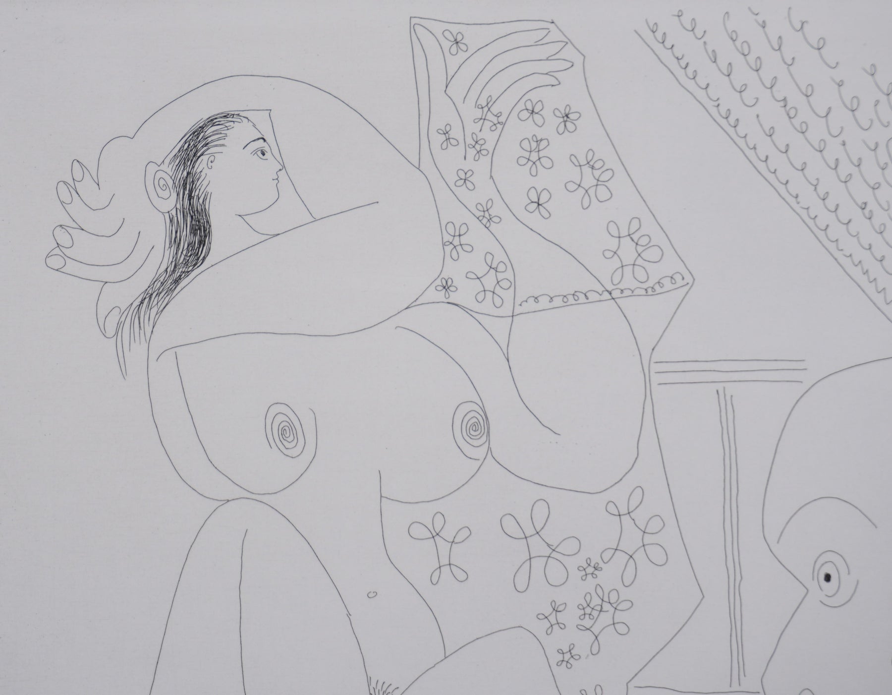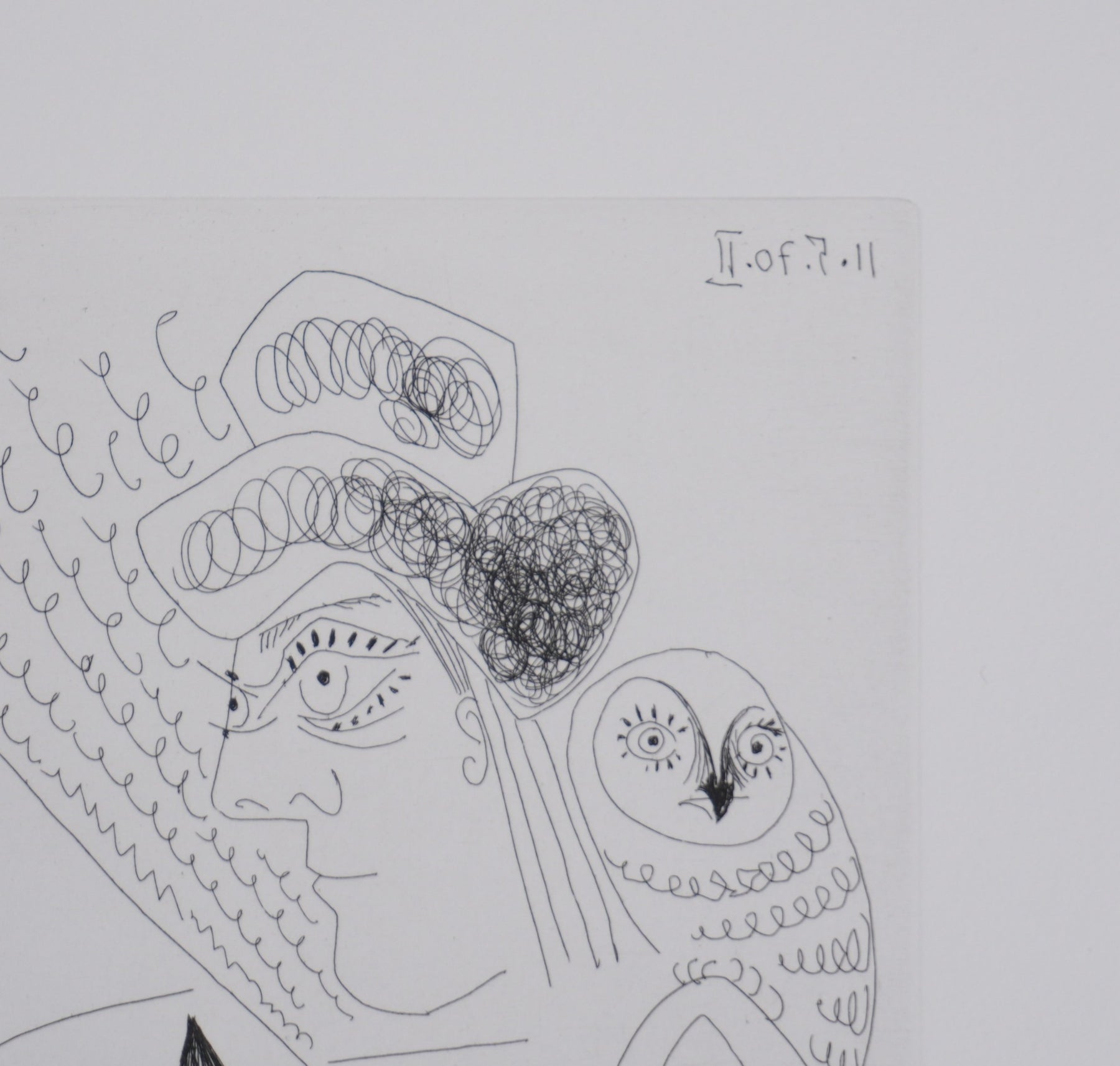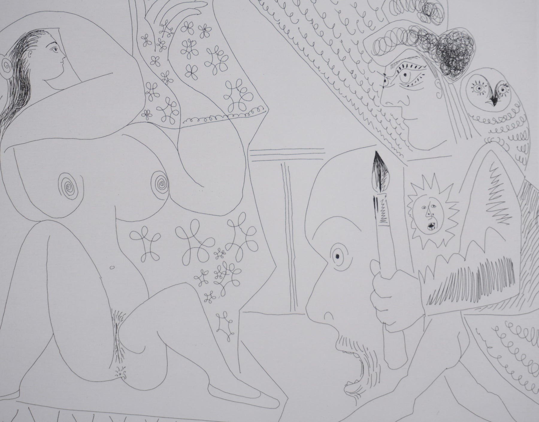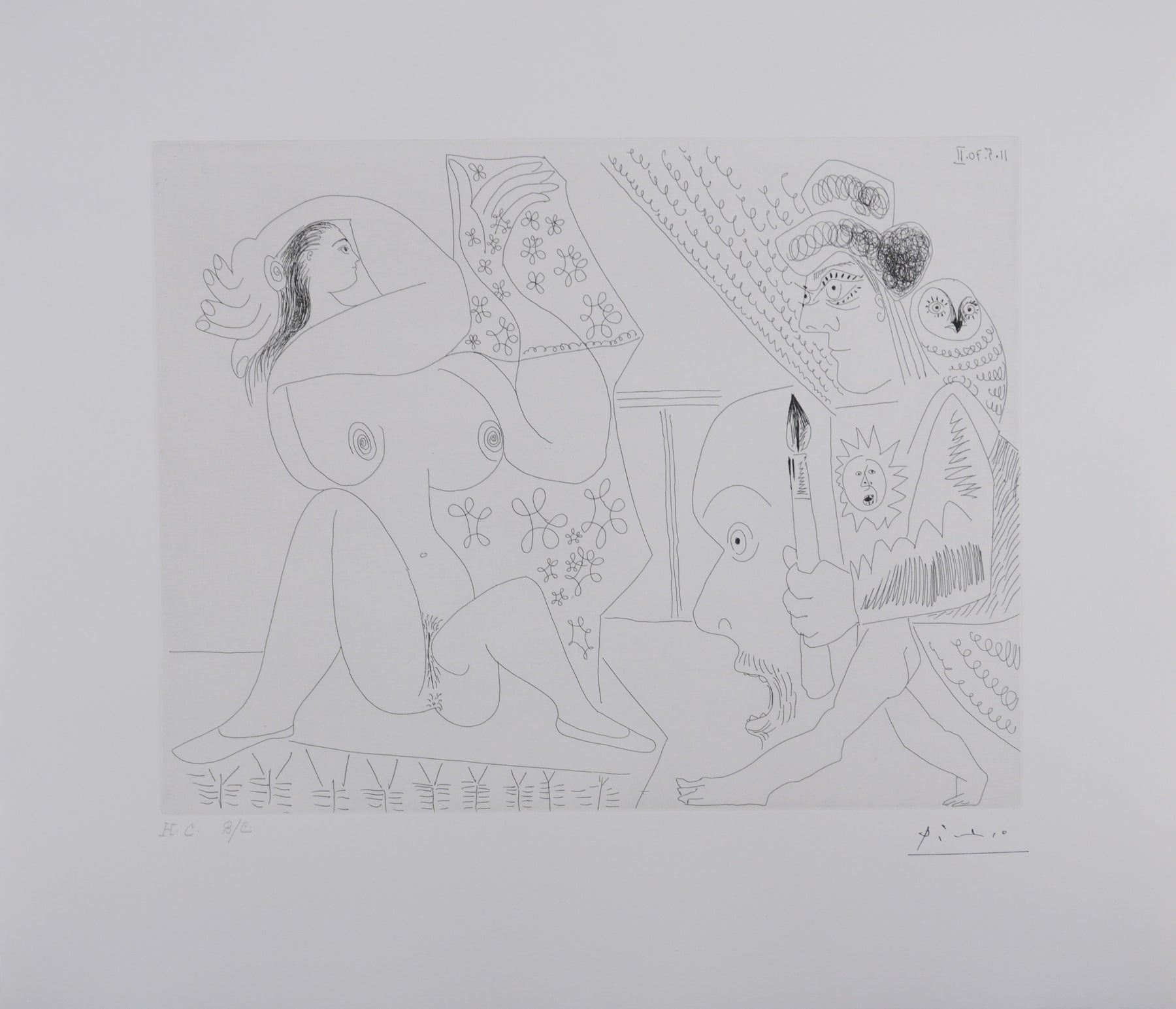 INFORMATION : La série dite des "156 gravures" est la dernière gravée par Picasso (alors âgé de plus de 90 ans) entre 1970 et 1972. Ces planches furent exposées à la galerie Louise Leiris, du 24 janvier au 24 février 1973, quelques semaines avant la mort de l’artiste, et l'édition fut achevée en 1978 dans les ateliers Crommelynck, fidèles amis de Picasso. Elles portent le cachet signature de l'artiste (Lugt 2026e).