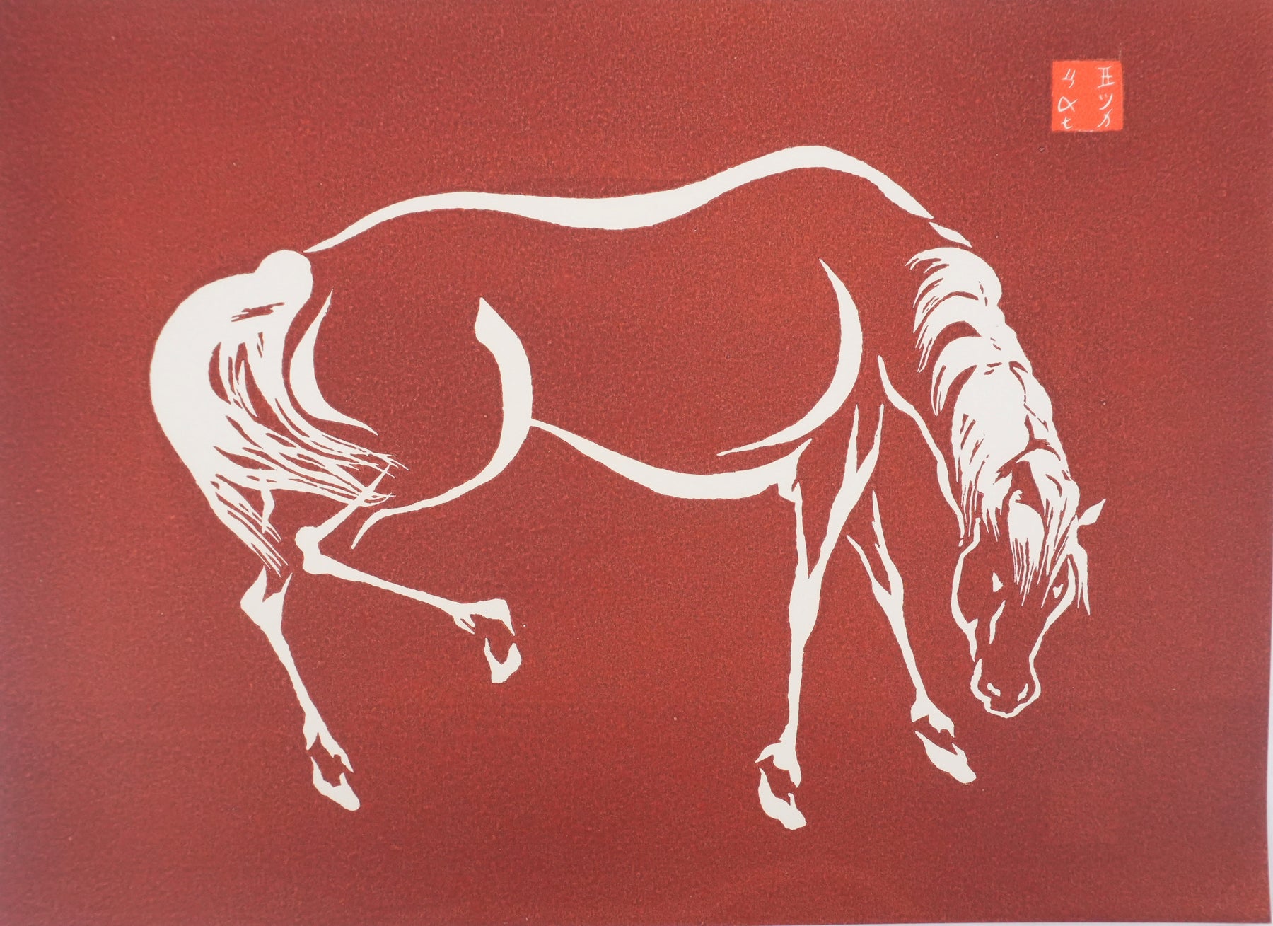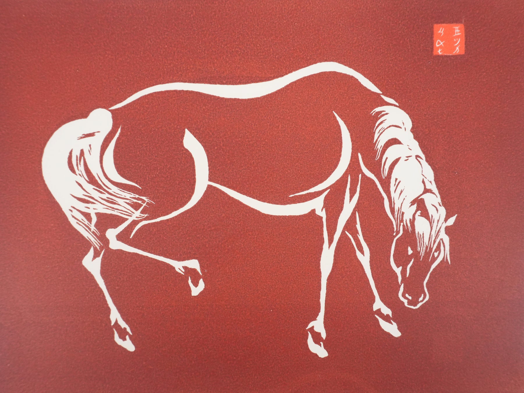 Lithographie sur fond rouge d'après un dessin à l'encre