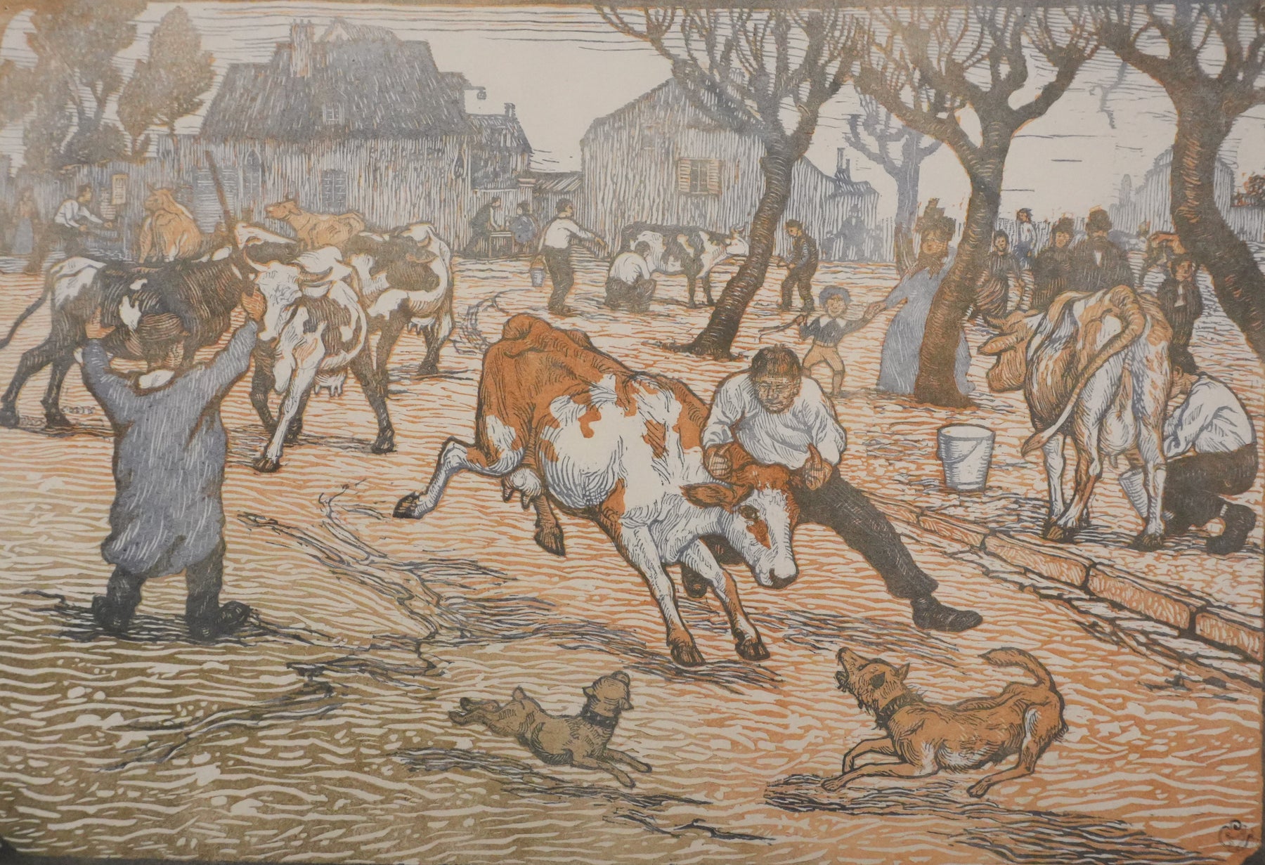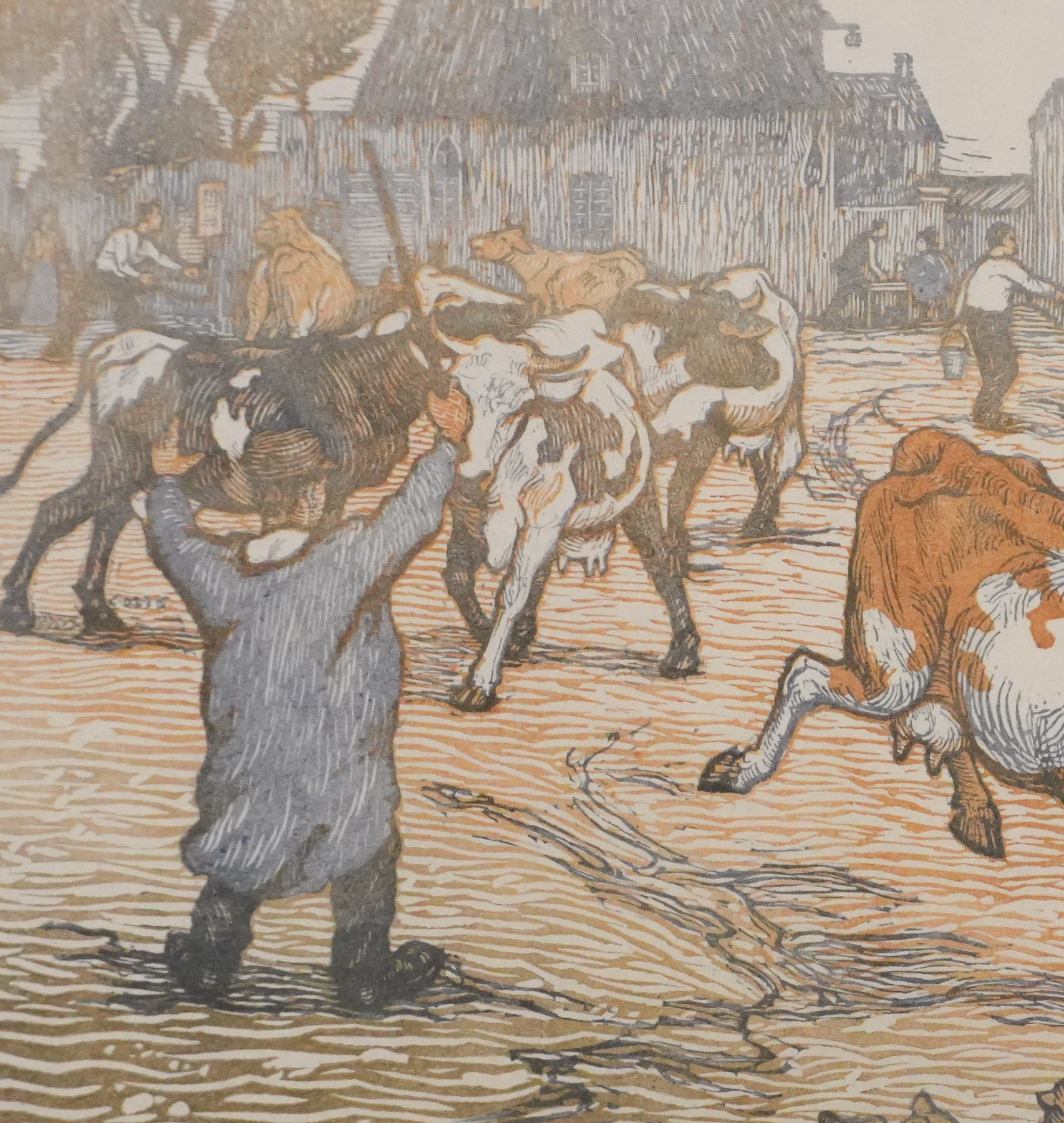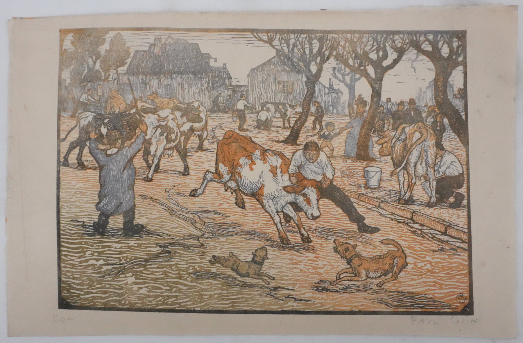 Paul-Emile COLIN : Les éleveurs de vaches (état brun), Gravure sur bois originale signée