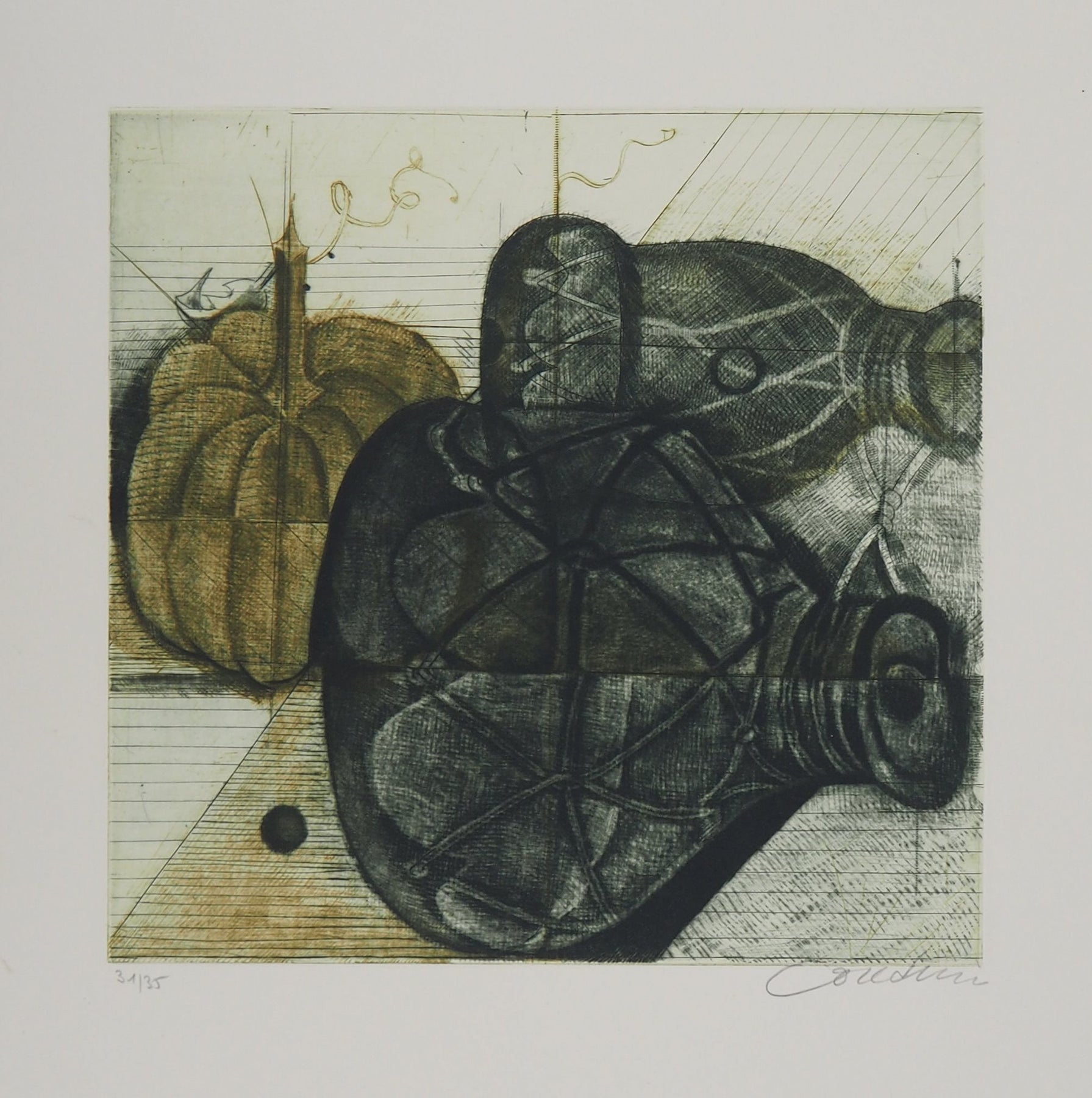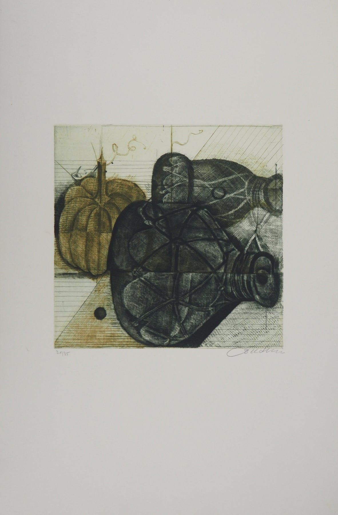 BT Brigitte COUDRAIN: Still life with bottles, Original signed engraving