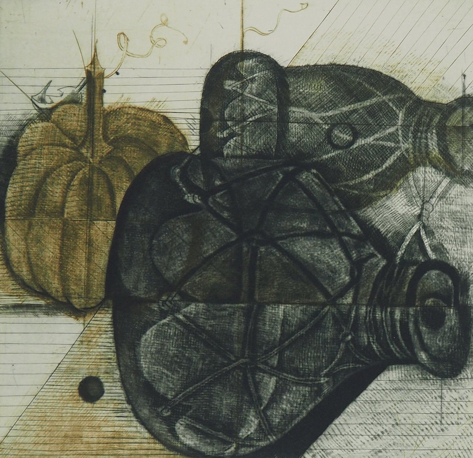 Brigitte COUDRAIN : Nature morte aux bouteilles - Gravure (détail)