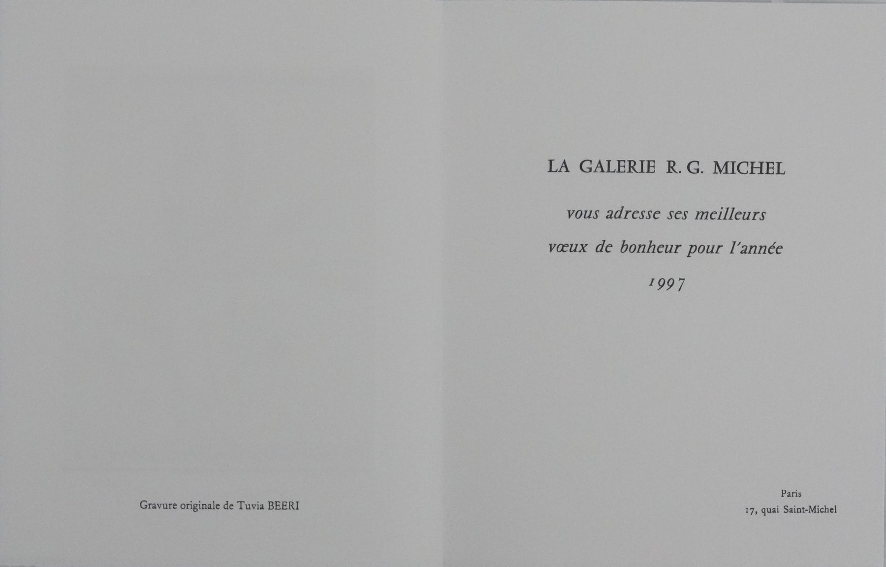 INFORMATION : Texte au dos. Carte de vœux éditée par la galerie R.G. Michel pour l'année 1997.