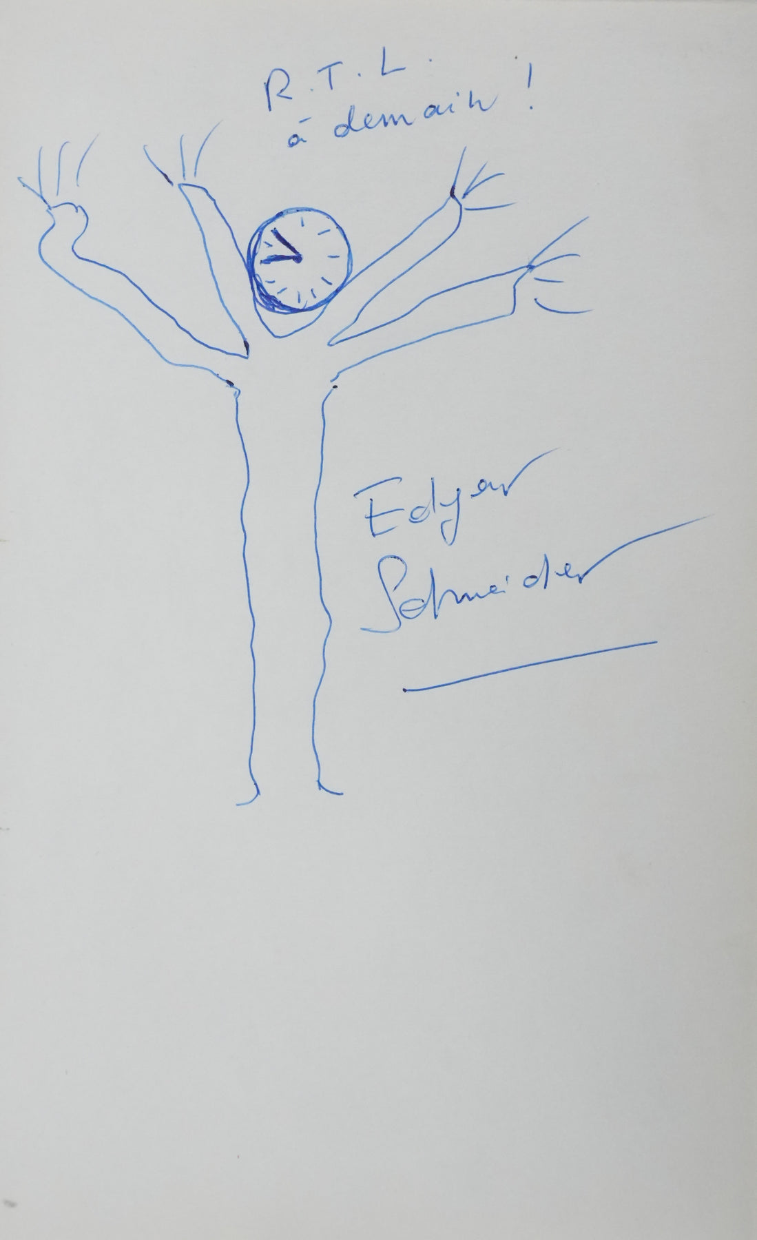 Edgar SCHNEIDER : L'horloge sur l'arbre, Autographe et dessin original signé