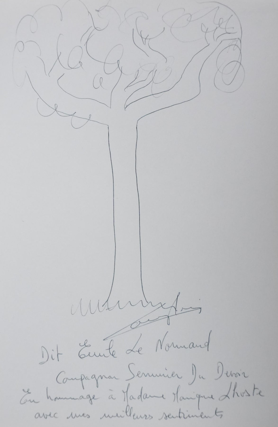 PROVENANCE : Ce dessin provient de la collection personnelle de Pierre Lhoste. Journaliste de radio, Pierre Lhoste (1913-1984) demanda aux personnalités qu’il recevait de réaliser un autographe accompagné d'un dessin d’arbre, constituant ainsi un témoignage unique de ses entretiens.