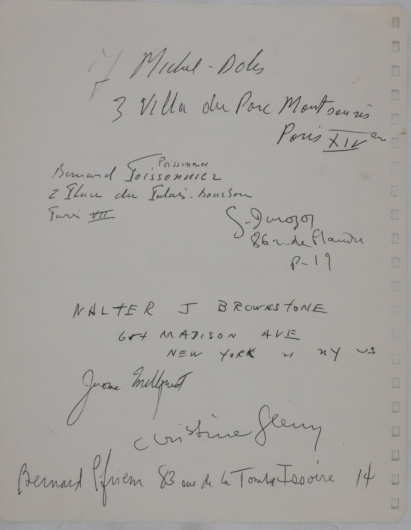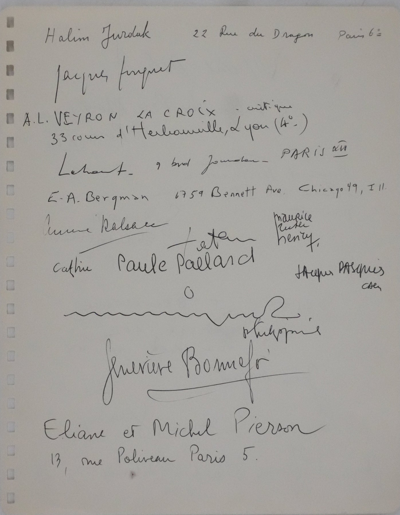 PROVENANCE : Livre d'or de la galerie le Point Cardinal (Paris) entre 1962 et 1964. Ensemble d'autographes laissés lors des expositions d'Unica ZURN, peintre et poétesse allemande, compagne d'Hans BELLMER.