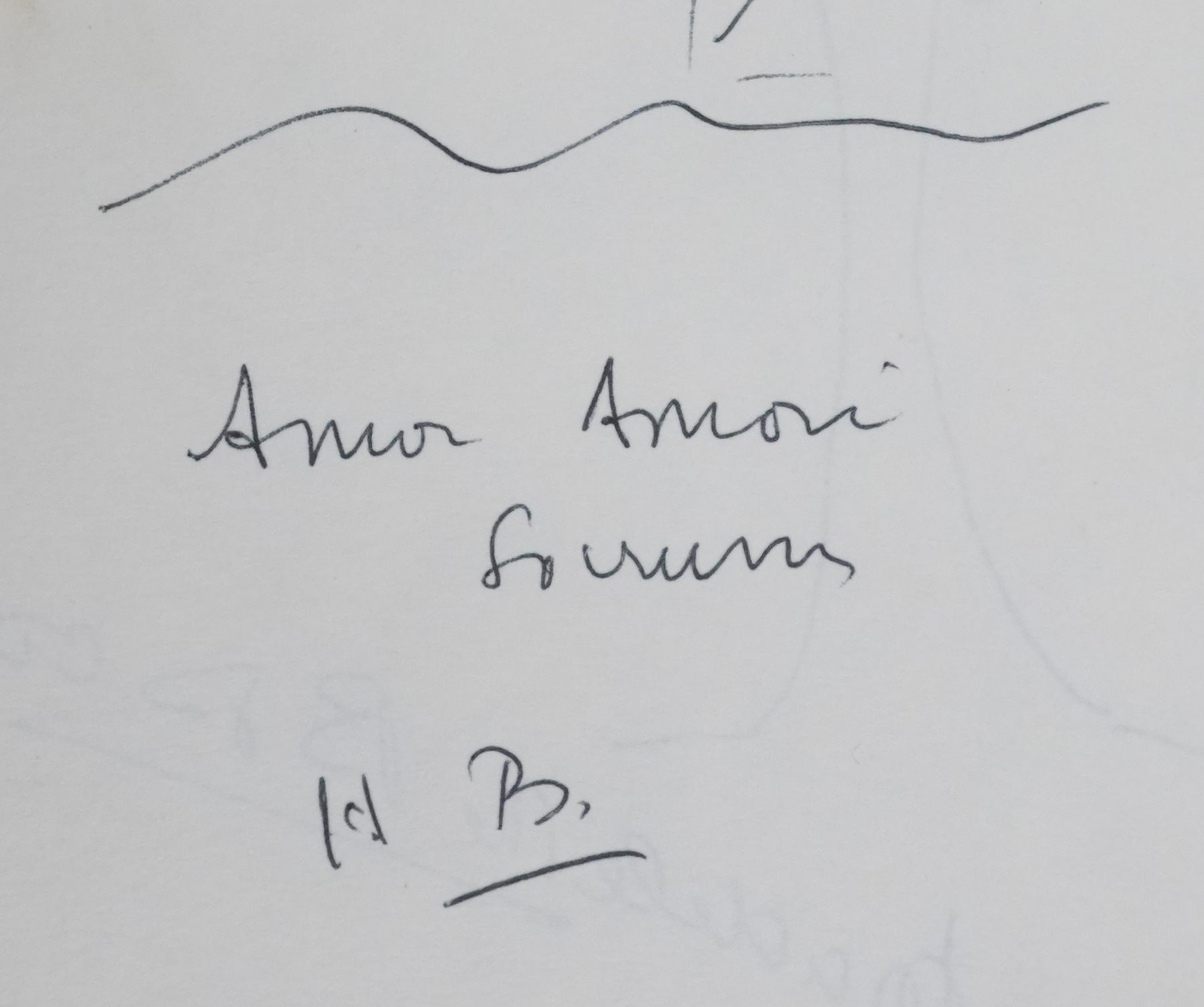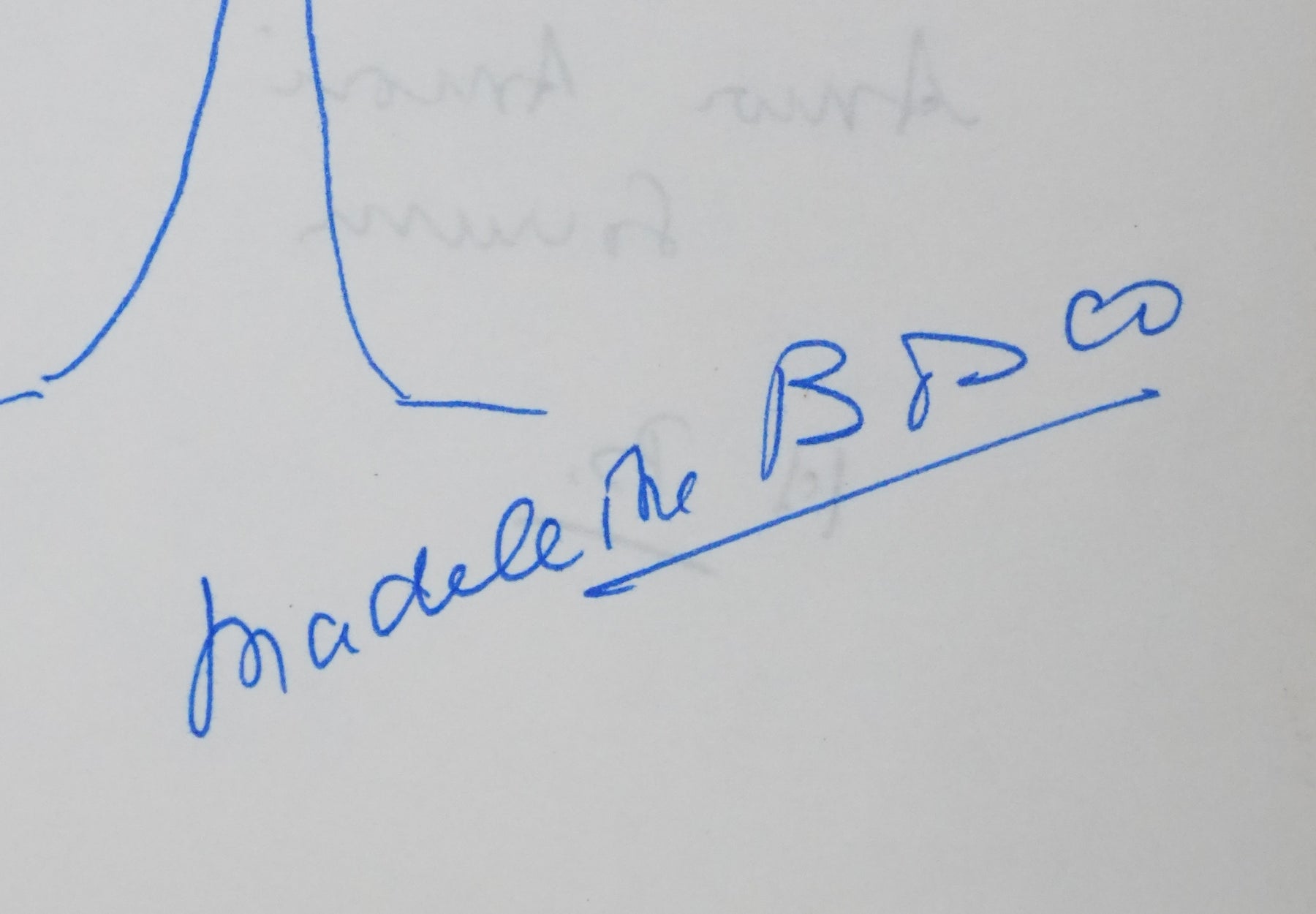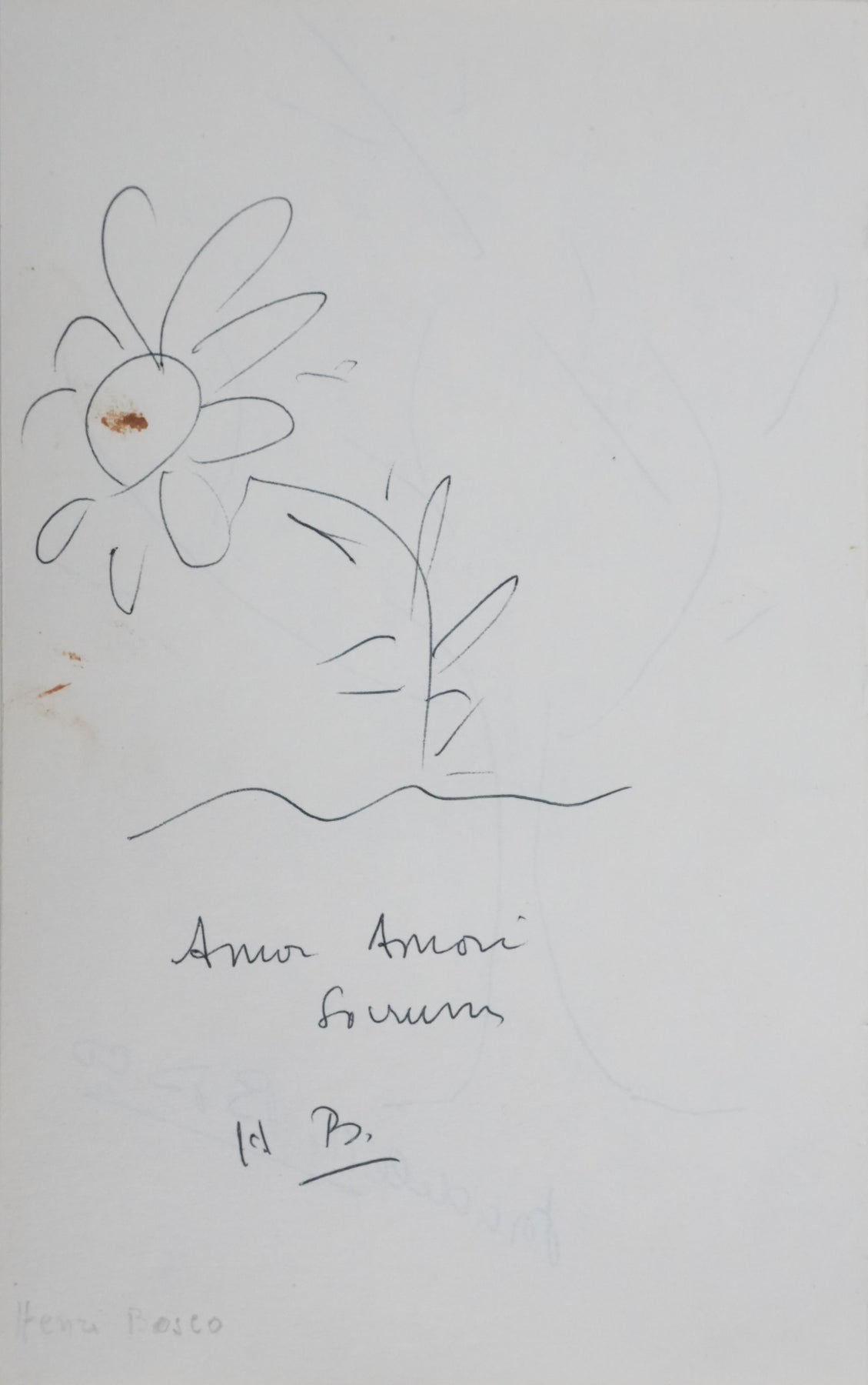 INFORMATION : Henri Bosco était un romancier et poète français. Son œuvre, empreinte de mysticisme et de lyrisme, célèbre la Provence et le lien entre l’homme et la nature. Auteur de romans tels que L’Enfant et la rivière, Le Mas Théotime ou Malicroix, il reçut le Grand Prix national des lettres en 1955 et fut membre de l’Académie de Marseille. Autre dessin à l'encre au verso de l'œuvre (voir photo). Au verso de l'œuvre, dessin et autographe de Madeleine Bosco, auteure(voir photo).