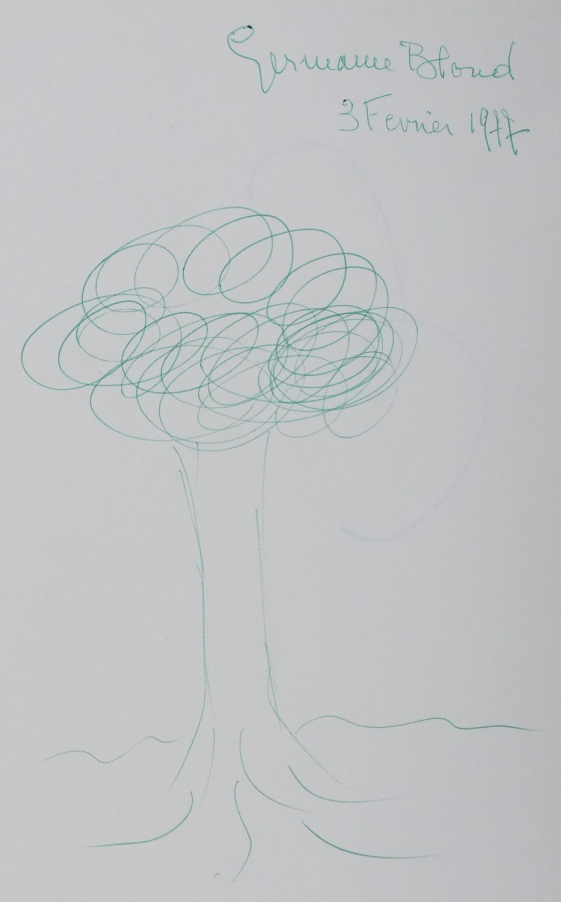 PROVENANCE : Ce dessin provient de la collection personnelle de Pierre Lhoste. Journaliste de radio, Pierre Lhoste (1913-1984) demanda aux personnalités qu’il recevait de réaliser un autographe accompagné d'un dessin d’arbre, constituant ainsi un témoignage unique de ses entretiens.