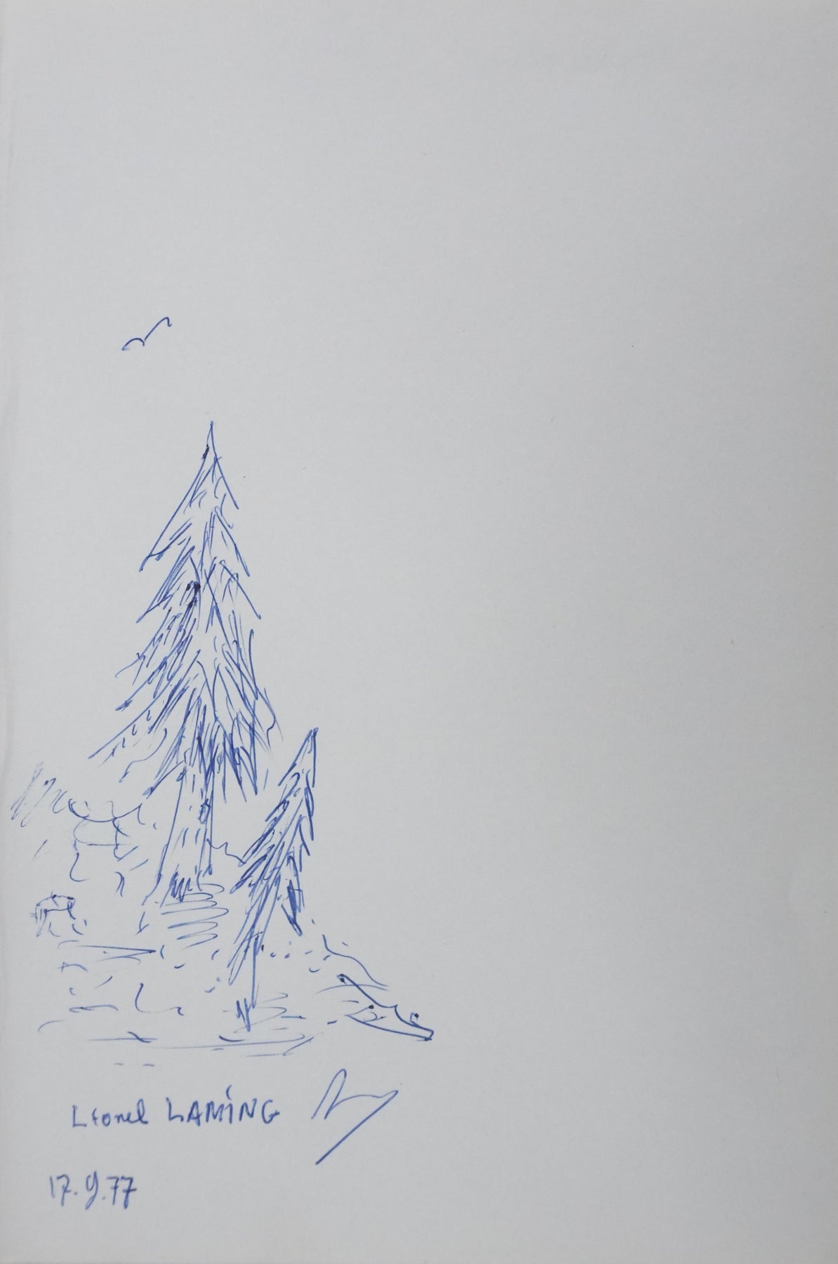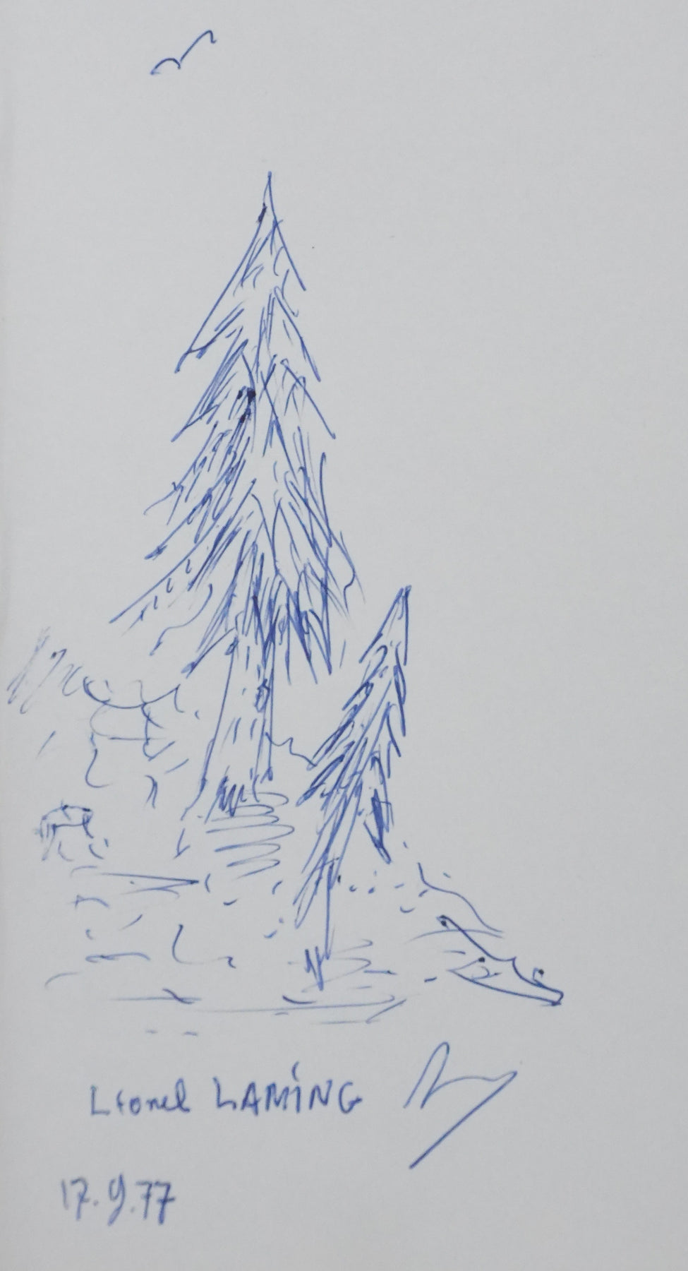 Lionel LAMING : Les arbres alpins, Autographe et dessin original signé