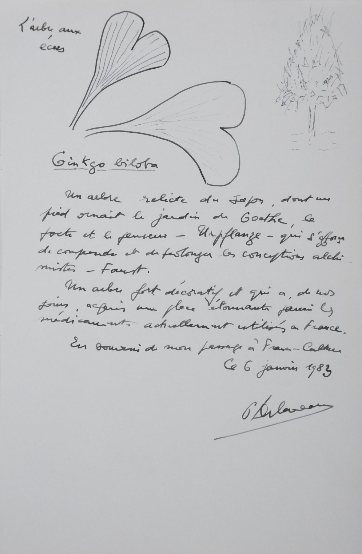 PROVENANCE : Ce dessin provient de la collection personnelle de Pierre Lhoste. Journaliste de radio, Pierre Lhoste (1913-1984) demanda aux personnalités qu’il recevait de réaliser un autographe accompagné d'un dessin d’arbre, constituant ainsi un témoignage unique de ses entretiens.