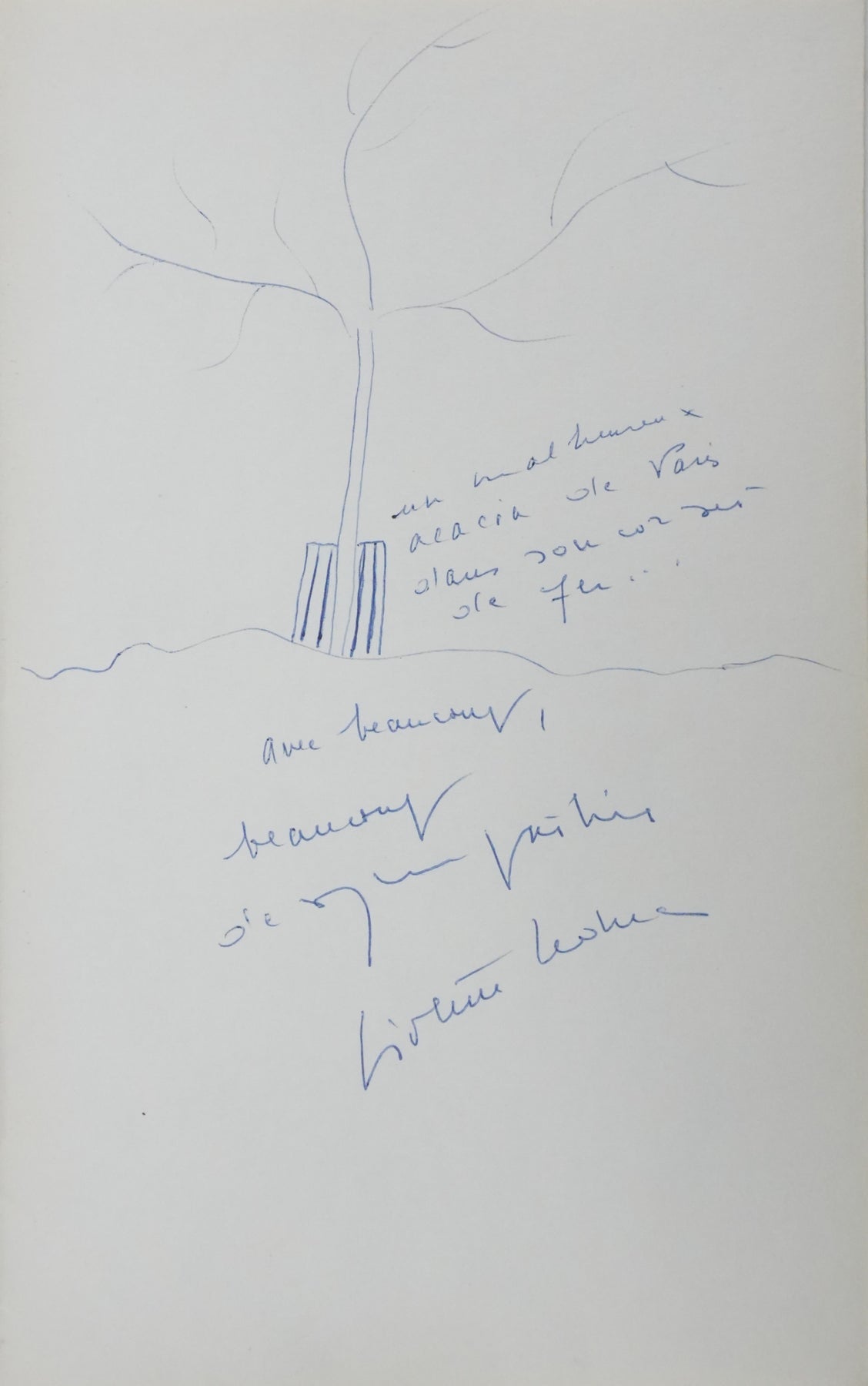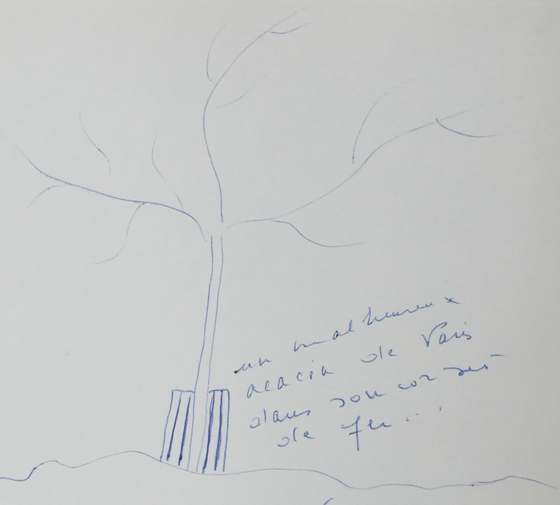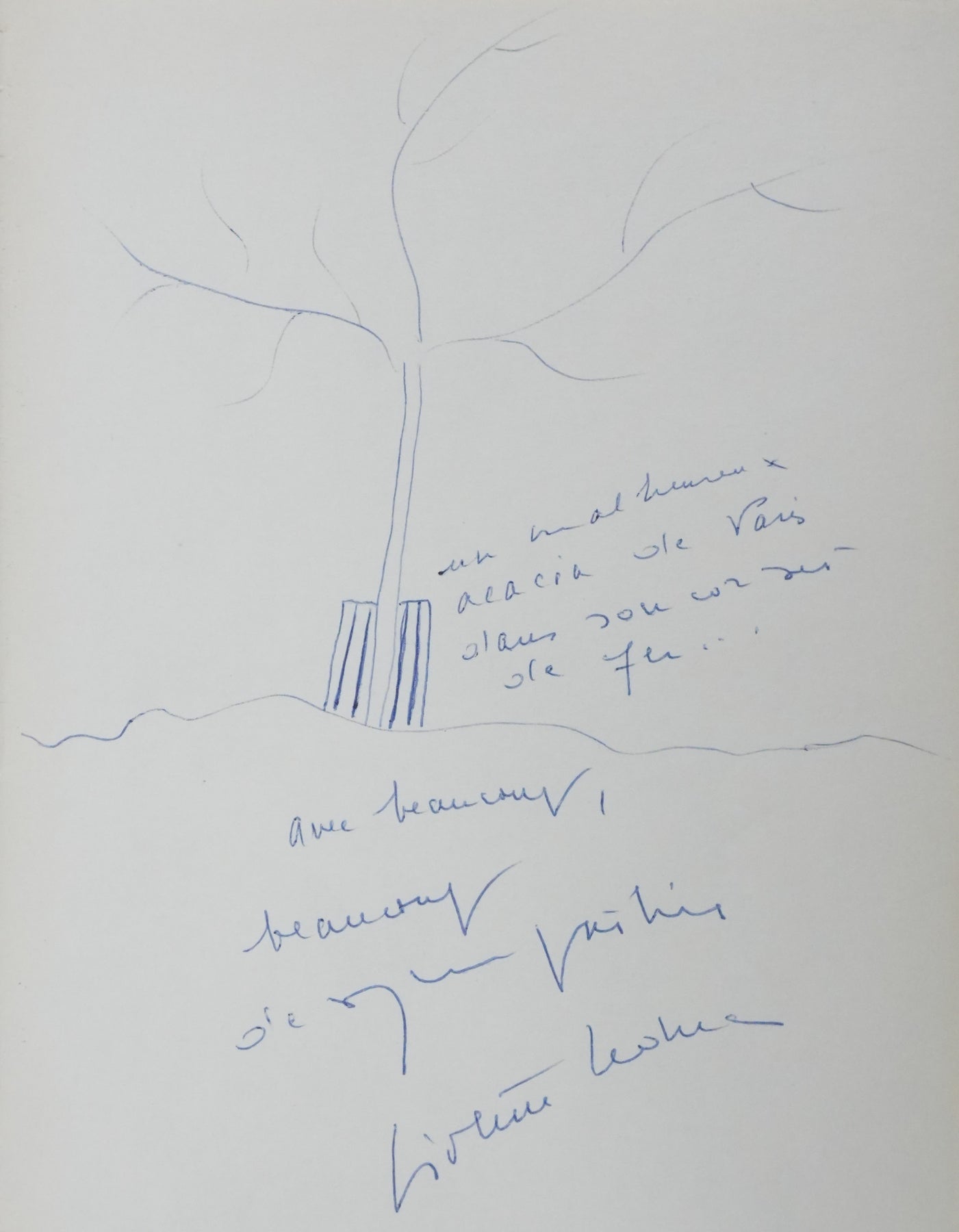 PROVENANCE : Ce dessin provient de la collection personnelle de Pierre Lhoste. Journaliste de radio, Pierre Lhoste (1913-1984) demanda aux personnalités qu’il recevait de réaliser un autographe accompagné d'un dessin d’arbre, constituant ainsi un témoignage unique de ses entretiens.